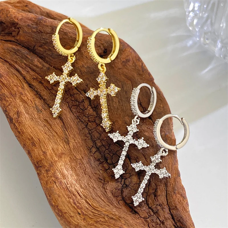 Step into a world of vintage charm and gothic elegance with these stunning cross-shaped drop earrings. Crafted from high-quality zinc alloy and finished with a luxurious KC golden plating, these earrings exude a shiny, metallic glow that catches the light beautifully. Each earring features a slender, rectangular post adorned with tiny, sparkling rhinestones, adding glamorous detail. From this post hangs a delicate circular connector supporting a intricately designed cross pendant, encrusted with countless tiny rhinestones covering its ornate, rounded arms. Available in both gold and silver tones, these earrings blend vintage aesthetics with modern fashion, making them perfect for parties or casual outings. Their eye-catching sparkle and luxurious finish ensure they become your chic accessory in any setting.