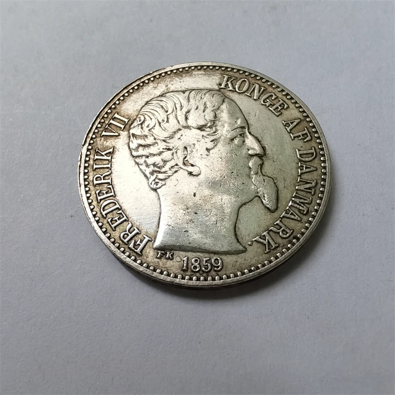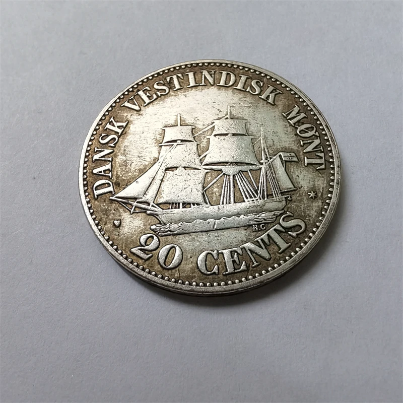 This antique-style collectible coin replica mimics a 20 cents coin from the Danish West Indies, dated 1859, and crafted between 1840 and 1859. Made from metal using casting techniques, it features intricate engravings, including a profile portrait of a bearded man facing right, surrounded by inscriptions such as “FREDERIK VII KONGE AF DANMARK” and the date “1859,” as well as a detailed sailing ship on the reverse with multiple masts and square-rigged sails, set against a plain background. The coin has a weathered, vintage appearance with a matte, silvery finish, emphasizing its handcrafted, antique aesthetic—perfect for collectors seeking a historical replica.