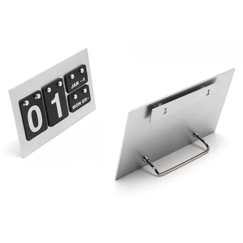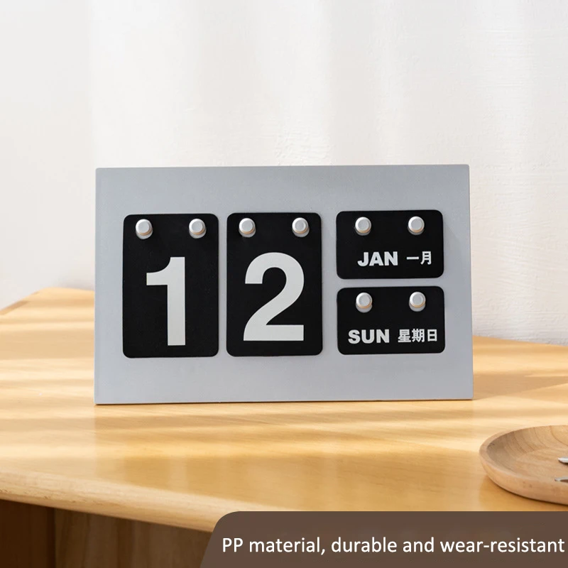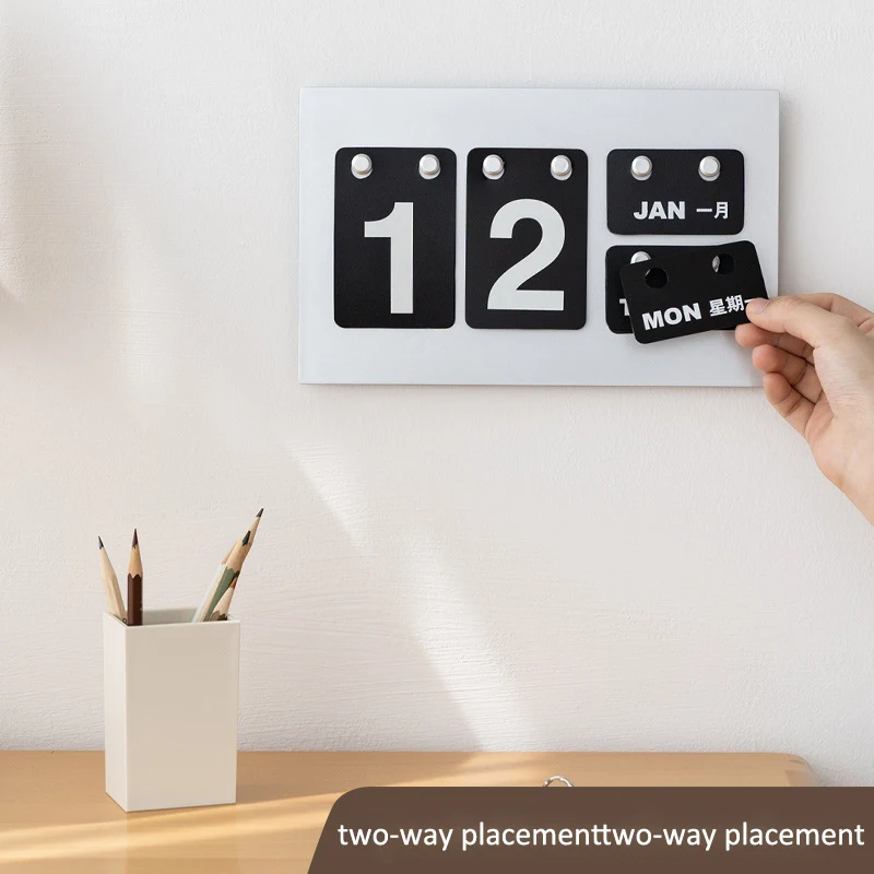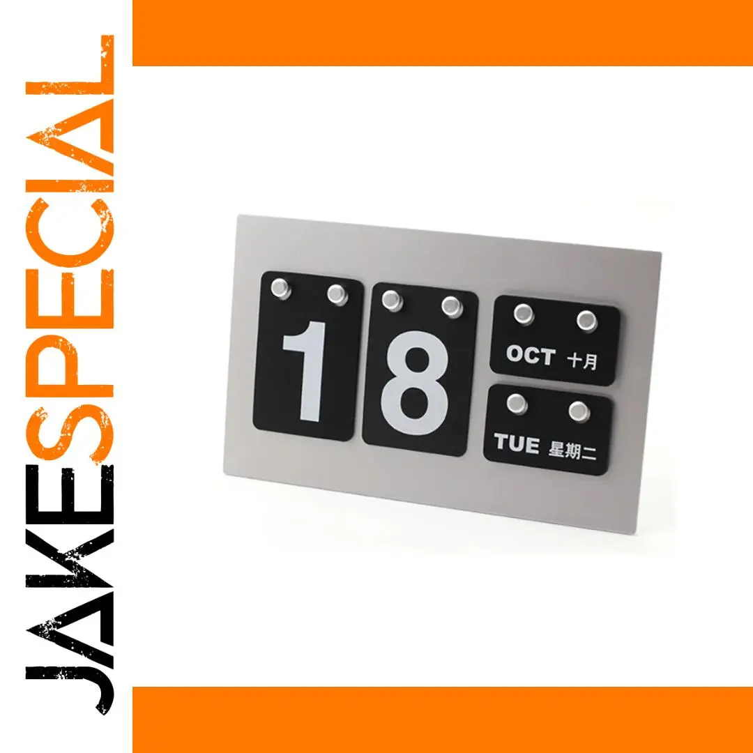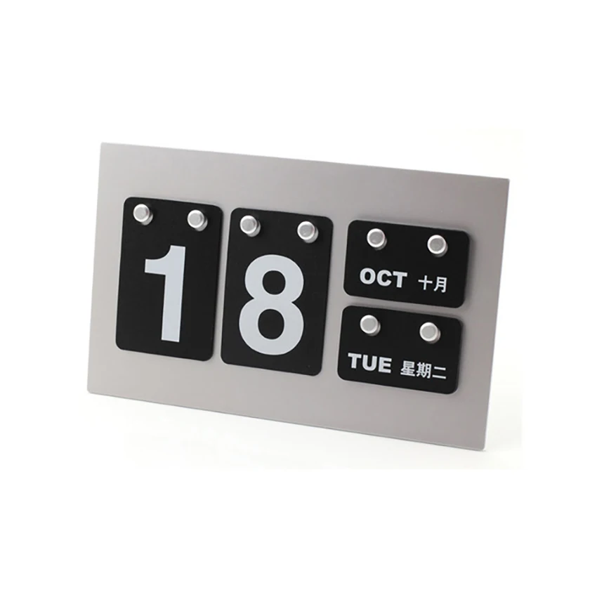 Step into timeless elegance with this vintage-style desktop standing calendar, designed as a charming table display. Its minimalist rectangular base supports a classic retro aesthetic reminiscent of vintage flip clocks, perfect for adding a nostalgic touch to cafes, hotels, or reception desks. The calendar features bold white digits on sleek black panels, showcasing the date “18” with a clean, rounded rectangular design. Smaller panels display the month “OCT” and the day “TUE,” both in white against black backgrounds, with Chinese characters adding an international flair. Small metallic pegs allow gentle adjustments for customization, making it as versatile as it is stylish. With its high-contrast visuals and vintage appeal, this calendar promises both functionality and sophisticated decor enhancement.