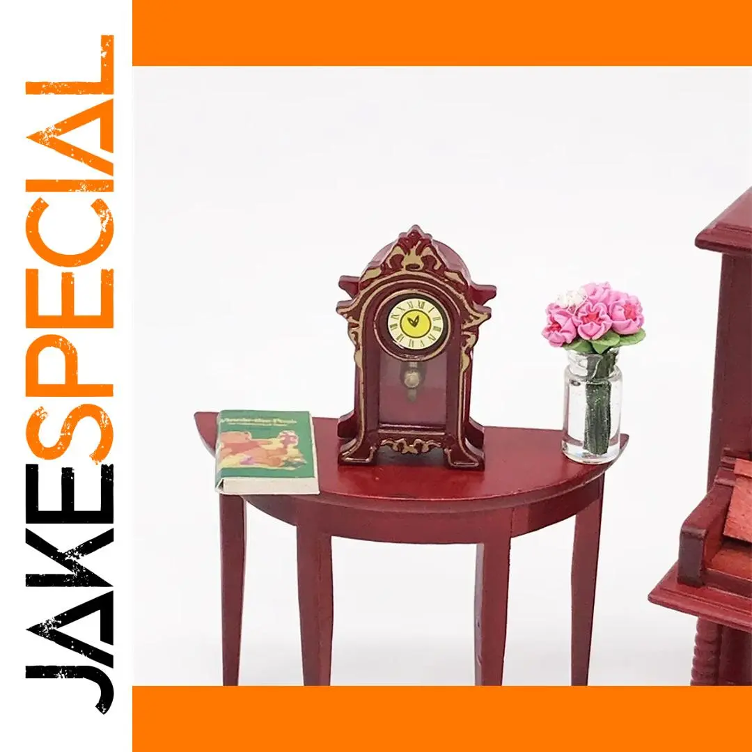 Step into a world of timeless charm with this meticulously crafted vintage miniature set, perfect for adding character and warmth to your dollhouse. Designed with attention to detail, each piece features warm, rich tones reminiscent of classic style. The deep reddish-brown wooden coffee table, measuring 5.8 x 3.8 x 5.0 cm, offers a sturdy yet elegant surface. The ornate mahogany clock, standing 4.7 cm tall and 2.8 cm wide, boasts a vintage design with Roman numerals and gold accents, adding a touch of opulence. Accentuating the scene are a delicate glass vase filled with realistic pink flowers and a vibrant, small book or magazine. This set invites you to create inviting, vintage-inspired spaces filled with personality and style.