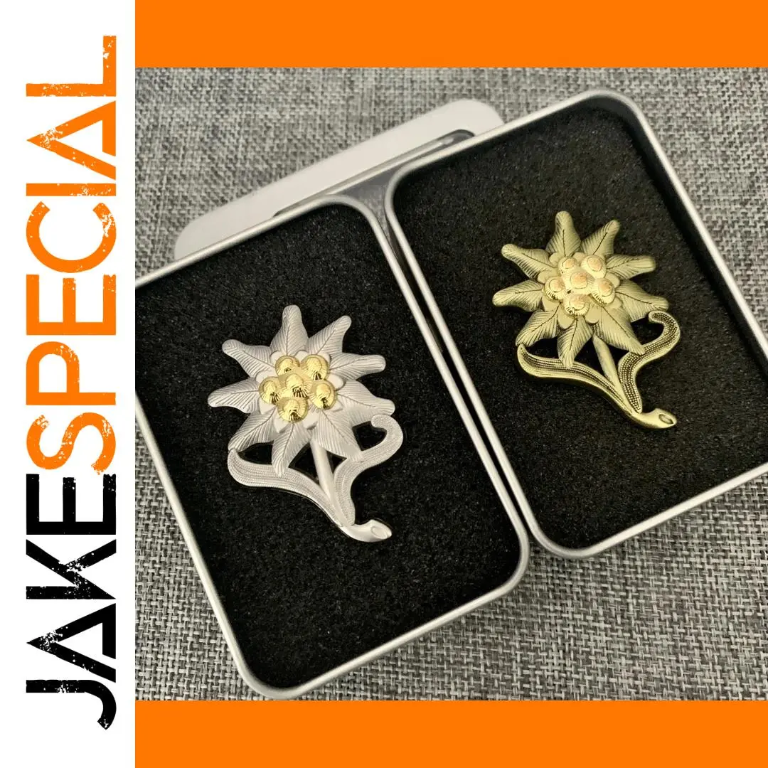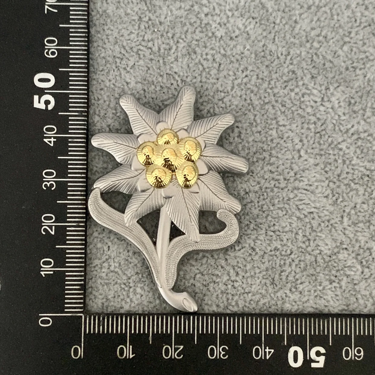 Imagine adding a touch of European nostalgia to your collection with this intricately designed vintage Edelweiss badge. Crafted from high-quality metal, it captures the essence of old-world craftsmanship with layered, textured petals and a detailed veined surface. The badge features two stunning color options: a refined silver tone with gold accents or a bold gold finish, each radiating vintage charm. The raised floral elements and curved stem create a three-dimensional effect, making it perfect as a costume accessory, decorative badge, or film prop. Its retro style evokes European elegance, ensuring that it stands out whether pinned on clothing or displayed as a collectible. Own a piece of craftsmanship that reflects historical artistry and refined detail.