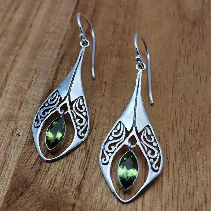Imagine elevating your style with these beautifully crafted vintage ethnic earrings that effortlessly blend tradition and elegance. Designed for women and girls, these drop earrings feature a stunning elongated teardrop shape with flowing, curved lines that create a graceful silhouette. Made from durable zinc alloy with a sophisticated silver finish, the earrings showcase intricate openwork patterns of swirling, curvilinear motifs reminiscent of traditional craftsmanship. At the center, a vibrant, faceted green stone or glass oval adds a lively splash of color, set securely within a matching metal frame. These versatile earrings are perfect for occasions ranging from weddings and parties to everyday outings, offering both style and a touch of cultural charm.