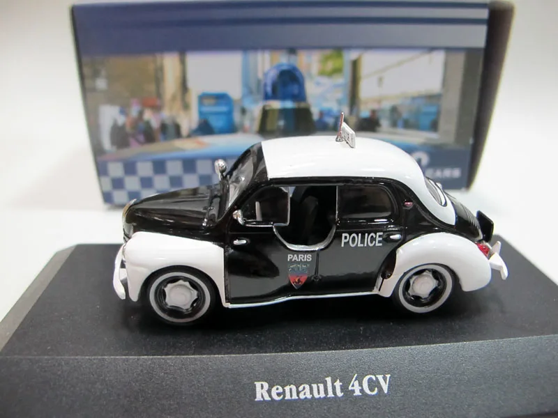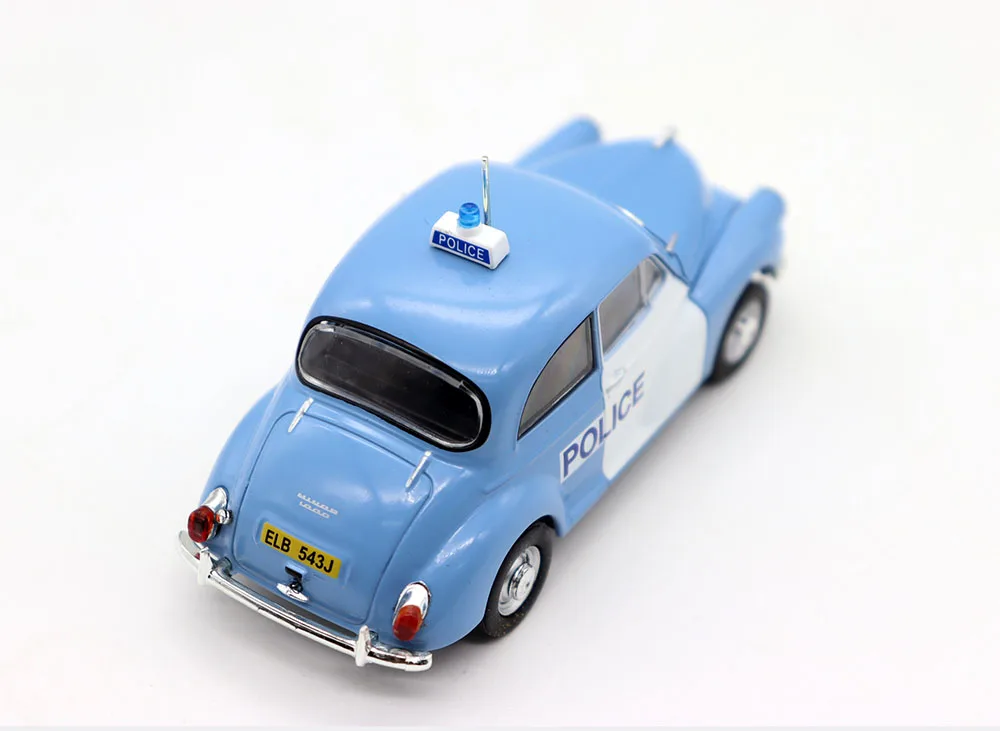 - Authentic vintage European police vehicle design with smooth, rounded contours, 1/43 scale, approximately 10cm long, detailed to replicate mid-20th-century classic cars.
