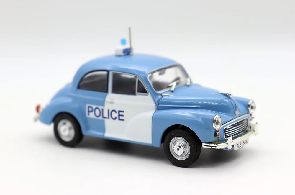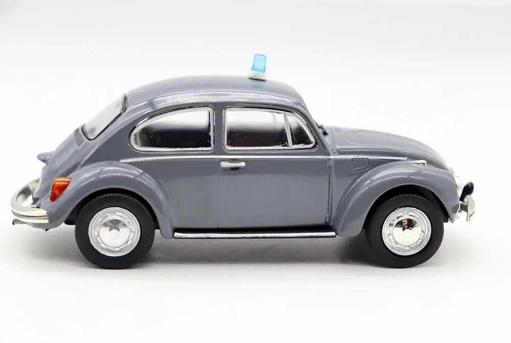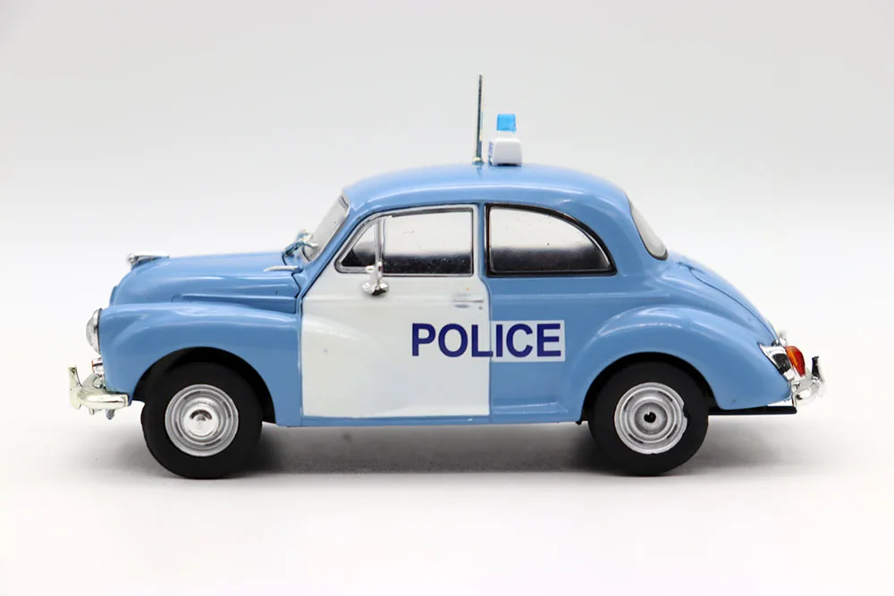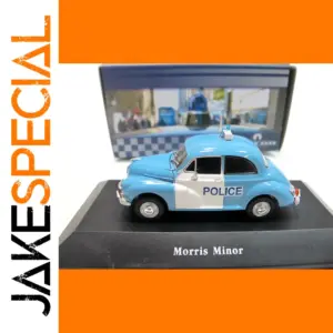 Step into the world of classic European police vehicles with this meticulously crafted miniature model from the Atlas Police Car Collection. Designed at a 1/43 scale, approximately 10 centimeters long, this diecast alloy model captures the authentic charm of vintage police cars. It features a sleek, rounded body painted in a distinctive light blue with a contrasting white door section where “POLICE” is boldly printed. The realistic details include chrome grille work, miniature headlights, side mirrors, and a blue siren light on the roof, along with a slender antenna. The model’s precise craftsmanship and proportioned dimensions make it a perfect collectible, adding vintage elegance to any display or collection.