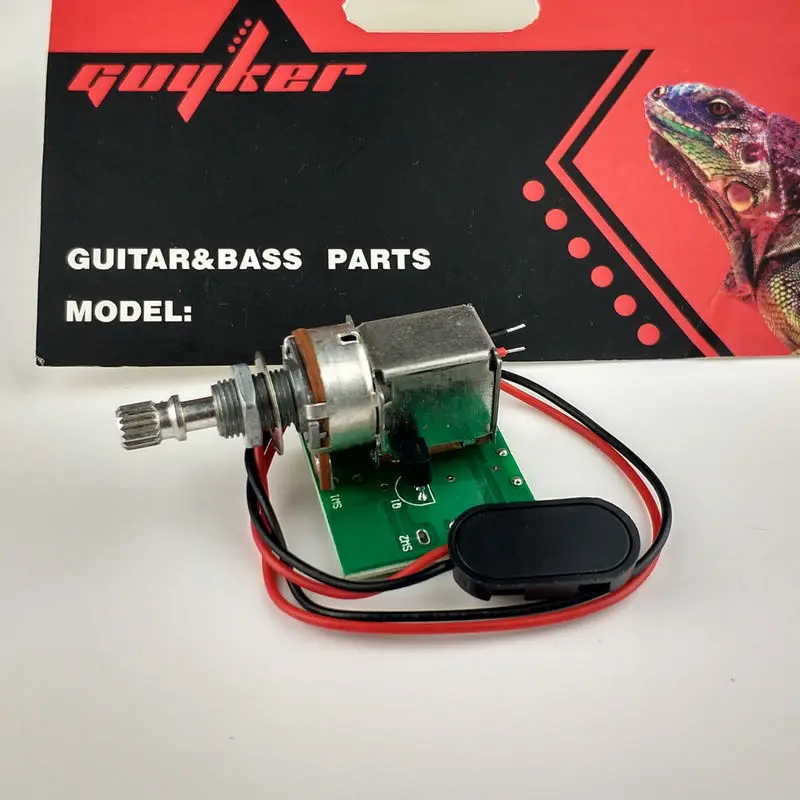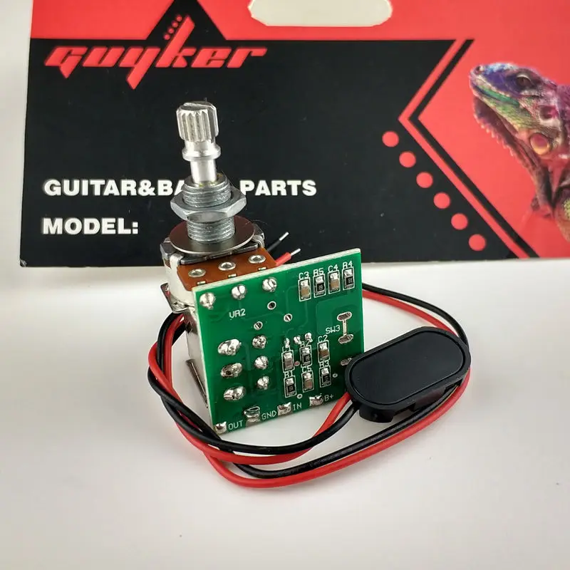 Experience enhanced tonal control with this vintage FET tone booster designed specifically for guitarists and bass players. Its compact, green rectangular circuit board features precision resistors and soldered contact points, emphasizing its technical sophistication and reliability. The robust metal construction ensures durability, while the sleek black plastic knob on the metal shaft allows for easy, smooth adjustments. The red and black wires connected to the circuit board facilitate seamless integration into your existing setup. With this device, you gain powerful bass response, increased volume, and crystal-clear treble, all while eliminating unwanted noise. Its vintage design complements classic aesthetics and modern performance needs, making it an ideal upgrade for your instrument's control system.