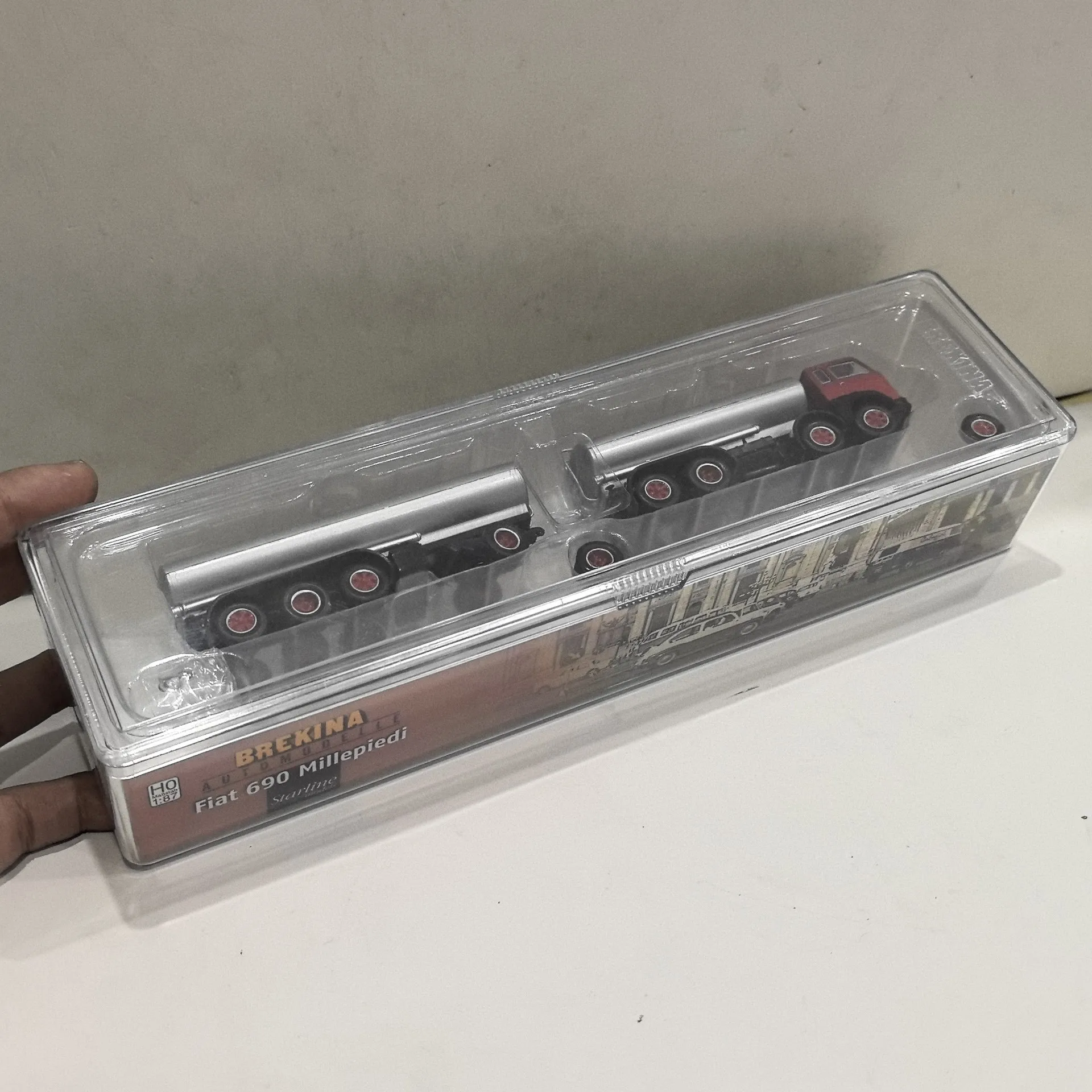 Step into the world of classic transportation with this meticulously crafted 1:87 scale model of the Fiat 690 Millepiedi oil tanker. Its vibrant glossy red cab with rounded edges and vintage styling evokes nostalgia, while silver accents and detailed features add realism. The dual silver tanks with rounded domes and vents beautifully capture the essence of a vintage transport vehicle. The black chassis with rotating wheels, paired with subtle white trim and logo, creates an authentic and eye-catching display piece. Perfect for adult collectors, this durable plastic model is designed for long-term enjoyment. Its sleek design and exceptional craftsmanship make it a treasured addition to any collection—bring a piece of automotive history home today.