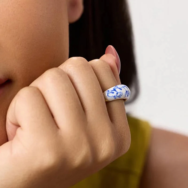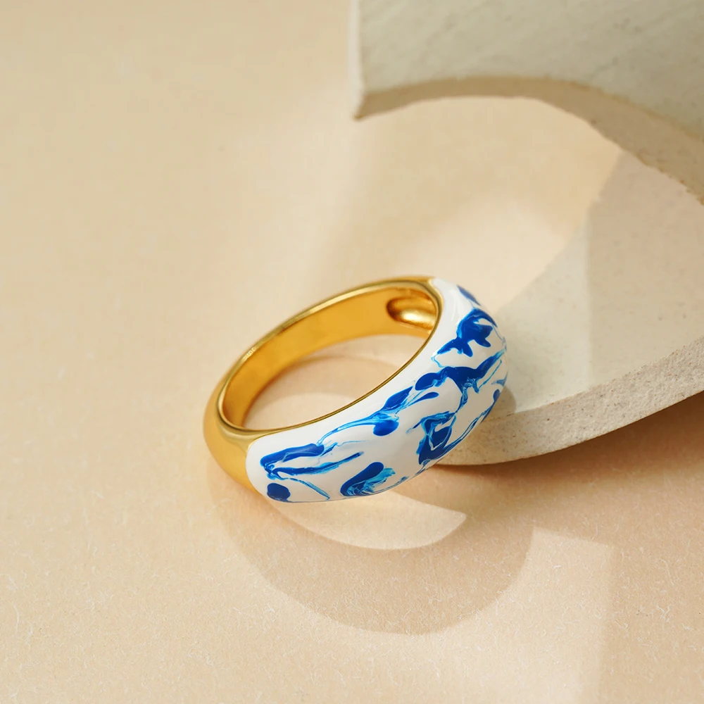Discover the timeless appeal of this vintage-style women's ring, designed to captivate and enchant. Crafted from copper with a radiant gold finish, this statement piece features a beautifully detailed round top adorned with a delicate white enamel background and an intricate blue floral pattern. Its rounded shape evokes a blooming flower, making it perfect for adding a touch of elegance to any special occasion, from parties to weddings. Available in sizes 6, 7, and 8, it fits all finger sizes comfortably, ensuring a versatile and stylish accessory for every woman who loves vintage-inspired jewelry. Whether you're gifting yourself or someone special, this ring enhances any attire with its artistic craftsmanship and vibrant color palette.