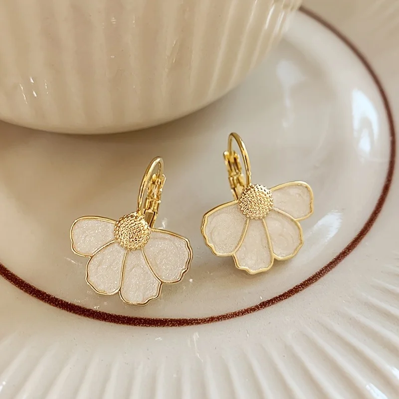 This vintage-inspired pair of drop earrings is crafted from lightweight copper alloy, featuring a delicate floral design with five white oil petals that shimmer subtly. The warm, gold-tone finish enhances their elegant, feminine appeal, perfect for both formal and casual occasions. Designed for women, these earrings showcase intricate textured spherical centers that highlight the floral motif, offering a sophisticated vintage aesthetic. Versatile and comfortable to wear, they add a touch of refined charm to any outfit, making them an essential accessory for those who appreciate timeless, feminine jewelry with a soft, graceful silhouette.