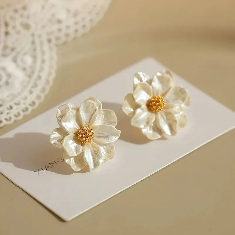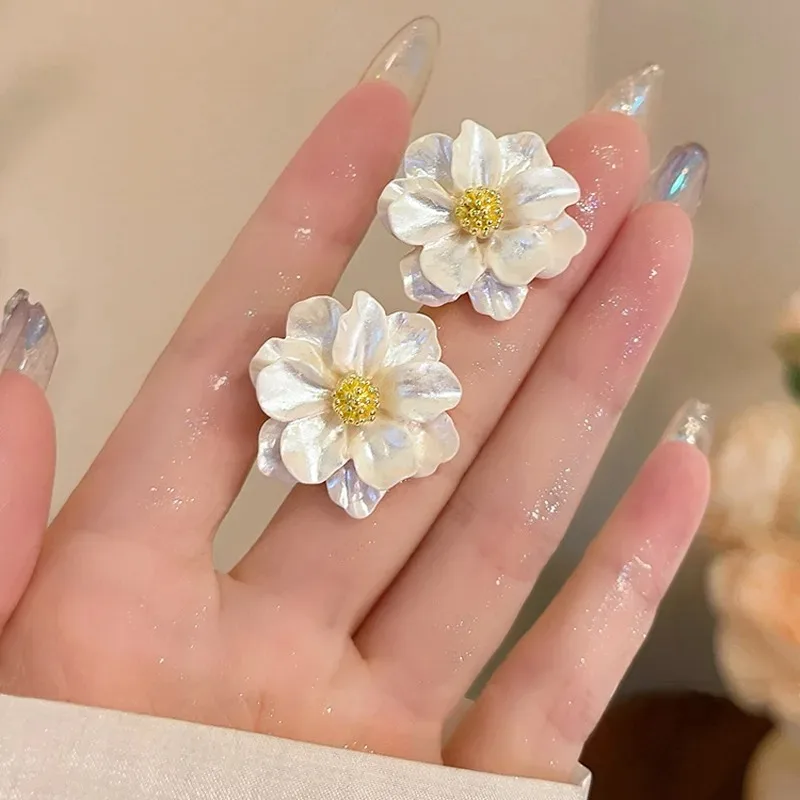 Step into timeless style with this pair of exquisite floral earrings by HYFAD, crafted from zinc alloy with a radiant gold finish. The design features delicate, irregular petal shapes that mimic natural flowers, creating a three-dimensional, layered appearance. The shimmering white surface enhances the luxurious pearl-like effect, while tiny golden beads at the center add a subtle metallic sparkle, elevating their vintage charm. Lightweight and comfortable, these earrings are perfect for any fashionable occasion, blending elegance with a touch of nature-inspired artistry. Their versatile style complements both casual and formal outfits, making them a must-have addition to your jewelry collection. Feel confident knowing you are wearing a unique, high-quality accessory that captures feminine grace and durability.
