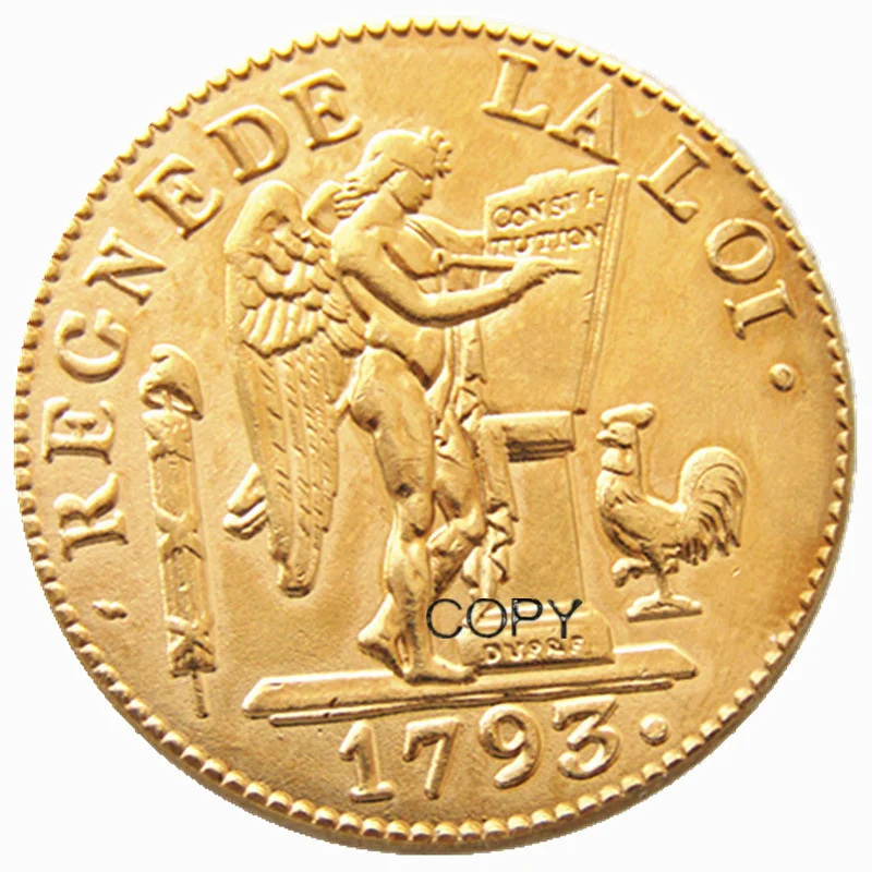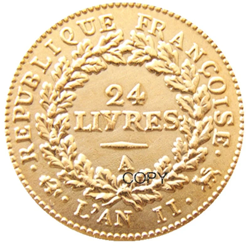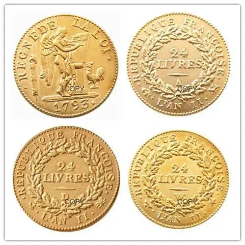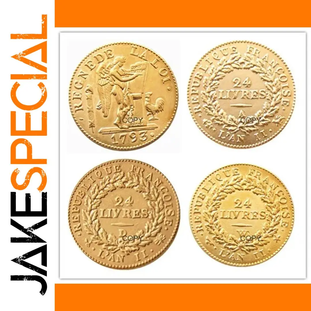 Enhance your collection with this set of three vintage-style replica coins inspired by 1793 French currency, featuring detailed engravings and ornate borders. Crafted in a rich gold-colored finish, the coins display patriotic themes with classical allegorical figures, decorative wreaths, and embossed inscriptions in traditional serif fonts. The set includes variants 1793A, 1793D, and 1793W, or a mixed 3-piece collection, all styled with a retro, nostalgic aesthetic reminiscent of European antique furniture from 1840 or earlier. Perfect for history enthusiasts and collectors, these coins blend intricate craftsmanship with timeless historical symbolism, adding a regal and historic touch to your display.