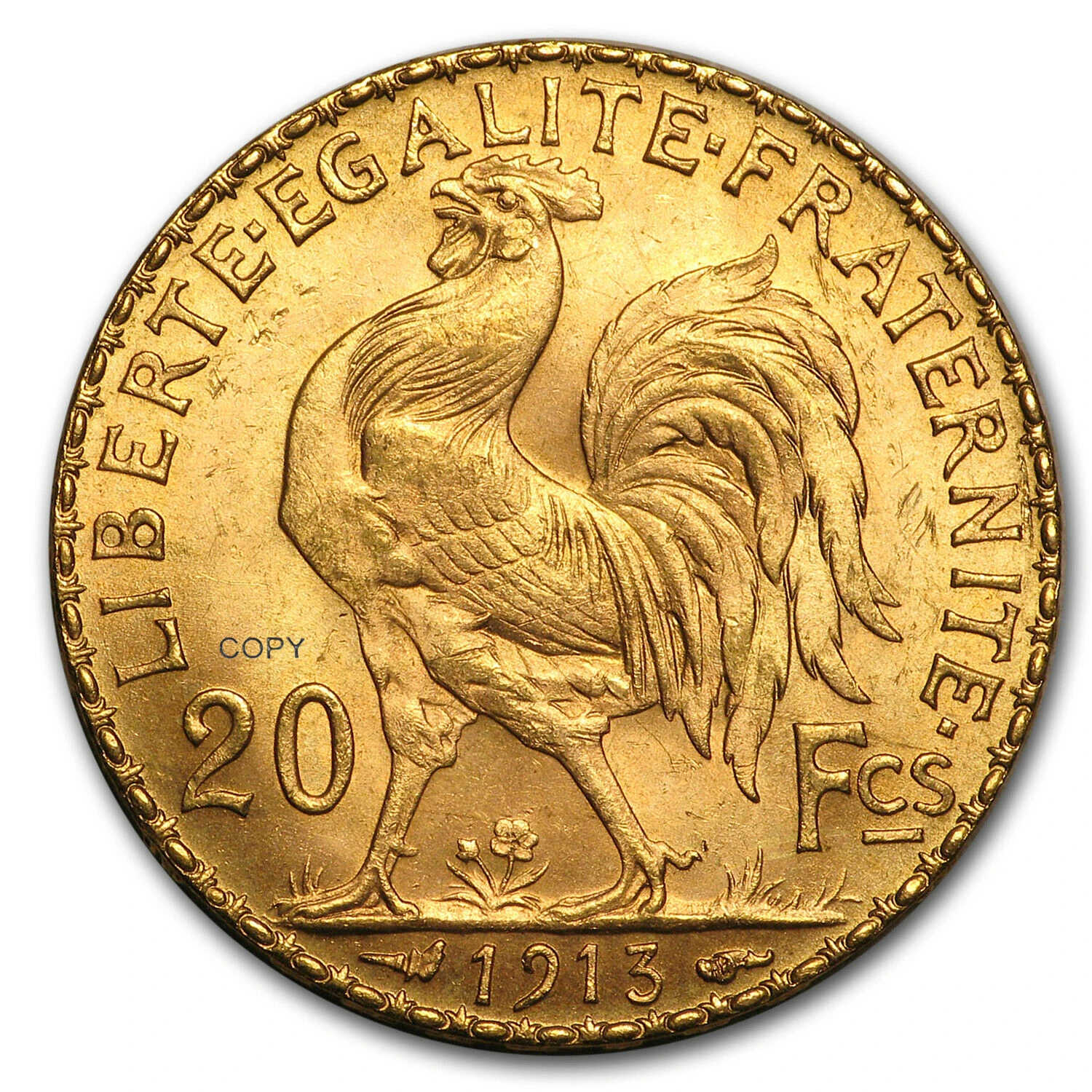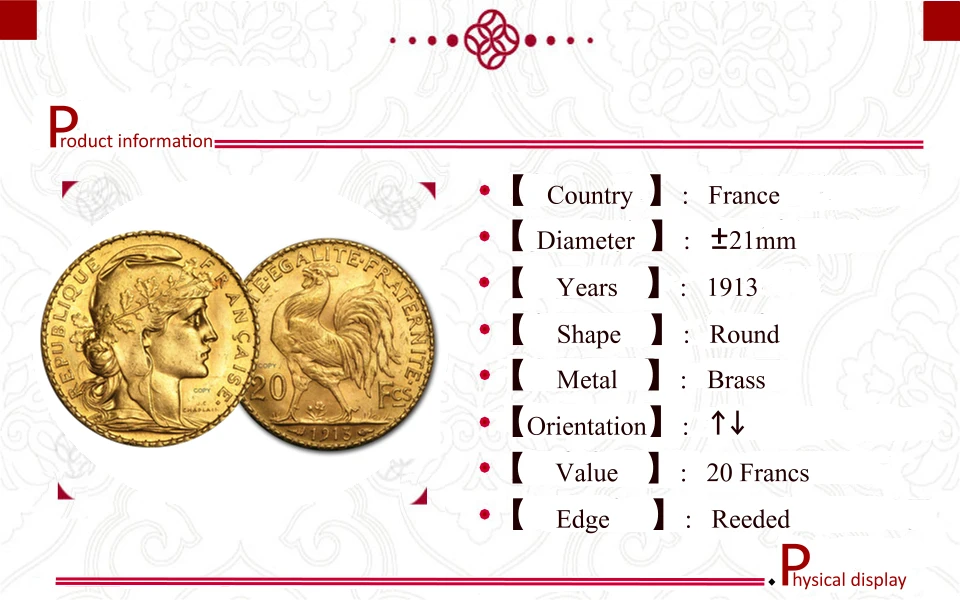 This meticulously crafted replica of the 1913 French Gold Marianne is made from durable brass with a luminous, reflective finish that highlights exquisite relief details. Featuring a high-relief profile of Marianne with flowing, wavy hair and a laurel wreath crown symbolizing victory and liberty, it showcases engraved inscriptions including “REPUBLIQUE FRANÇAISE,” “J.C. CHAPLAIN,” and “COPY,” ensuring authenticity. The design accurately reproduces the original 20 Franc gold from 1913 with proportions and dimensions that offer a vintage, substantial presence ideal for display or collection, blending historical fidelity with refined craftsmanship.