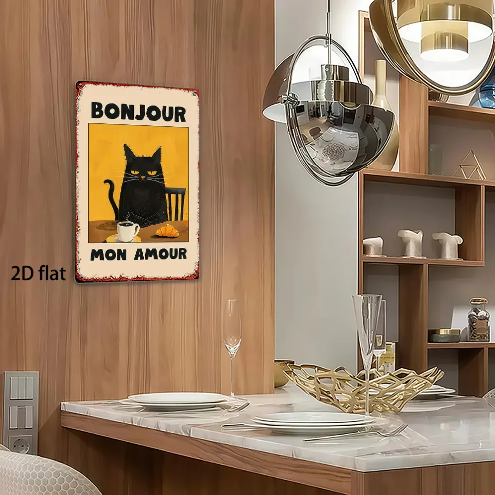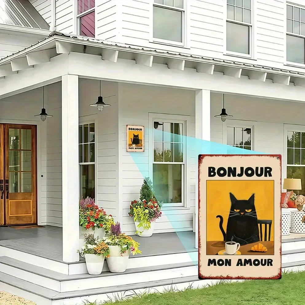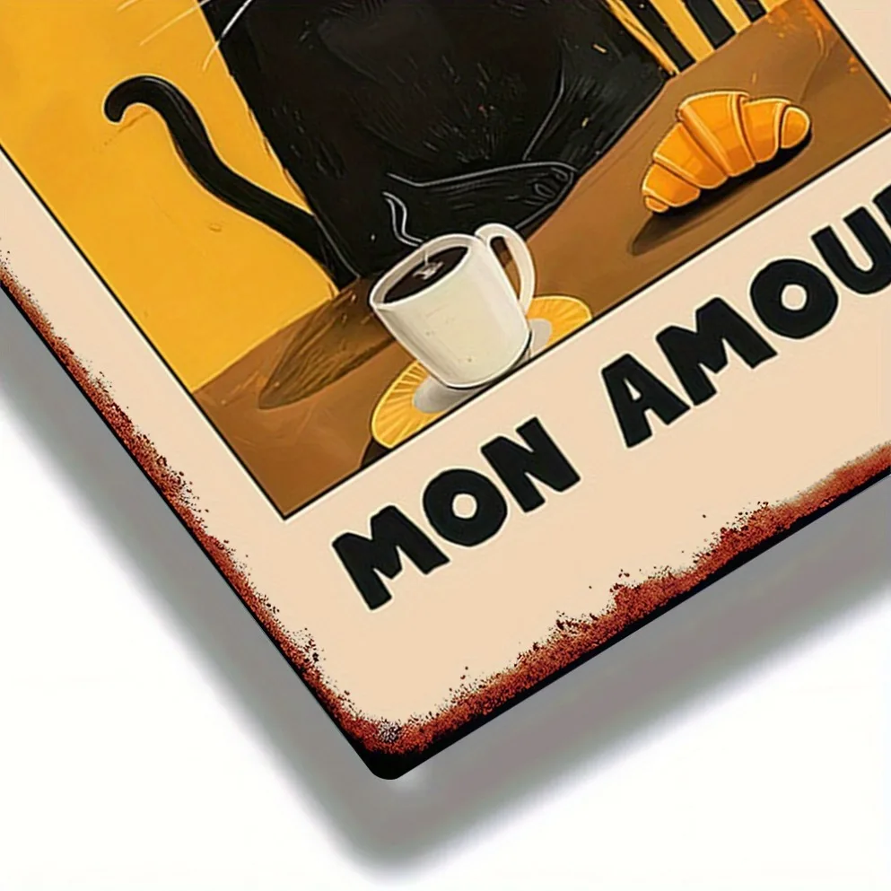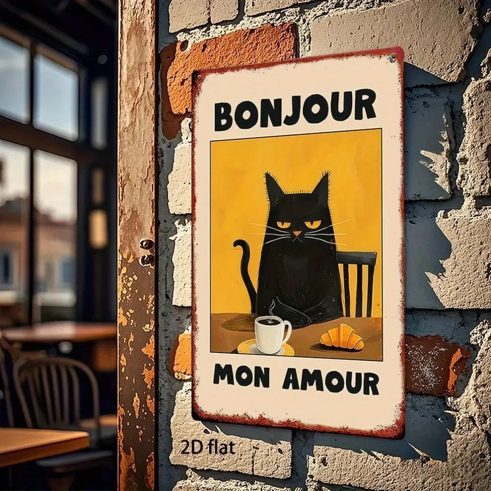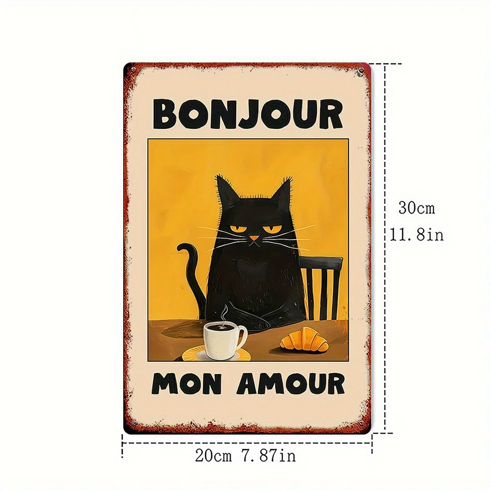 Add a charming touch to your space with this vintage-style aluminum wall sign measuring 20cm x 30cm (8×12″) and weighing approximately 120g. Featuring a distressed black finish, red accents, and a French-inspired design, it displays “Bonjour & Mon Amour” in bold, playful lettering. The sign depicts a stylized black cat sitting on a wooden chair with a steaming coffee cup and croissant, creating a cozy, rustic ambiance. Suitable for indoor or outdoor use, it includes predrilled holes for easy hanging on walls in cafes, homes, bars, or garages. Its vintage aesthetic and durable construction make it a delightful décor piece for any lover of charming, nostalgic style.