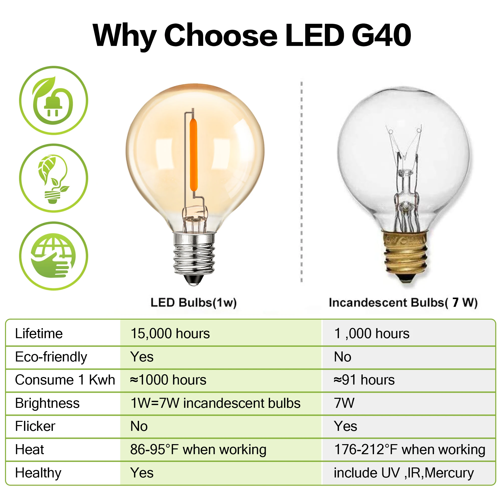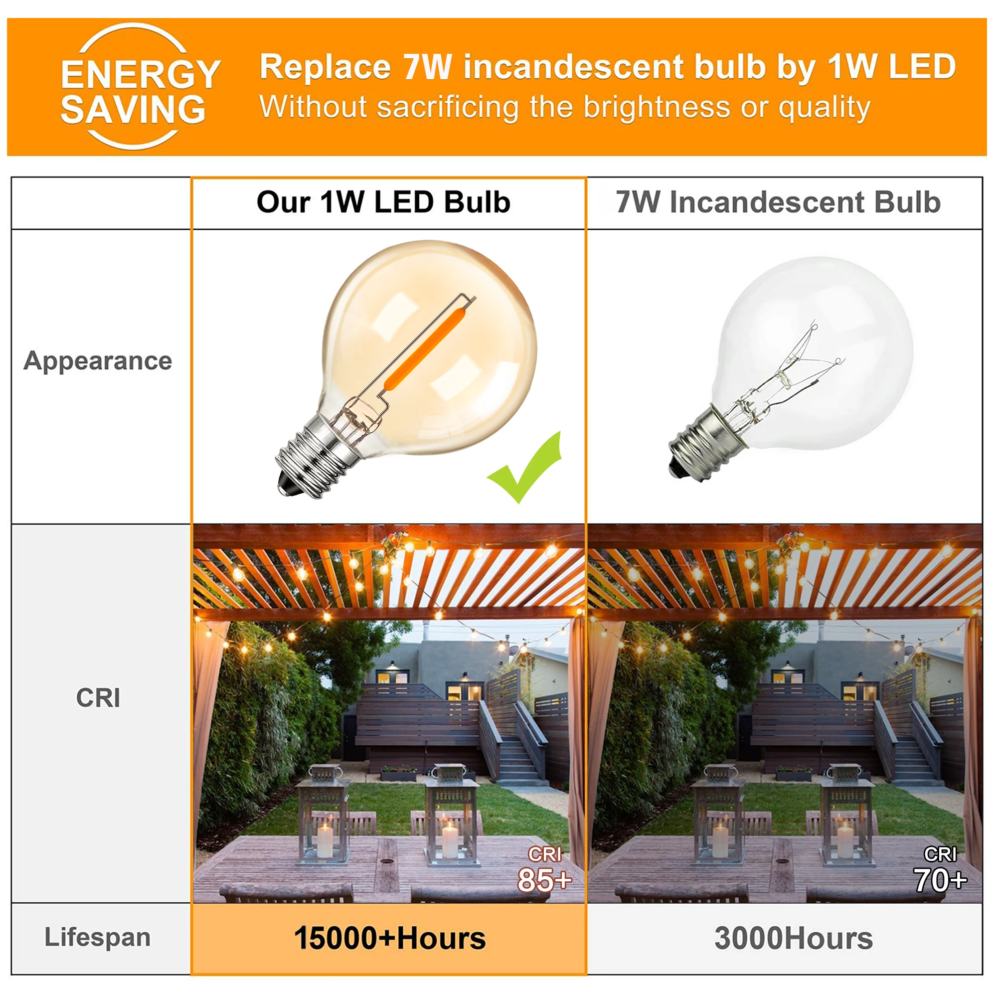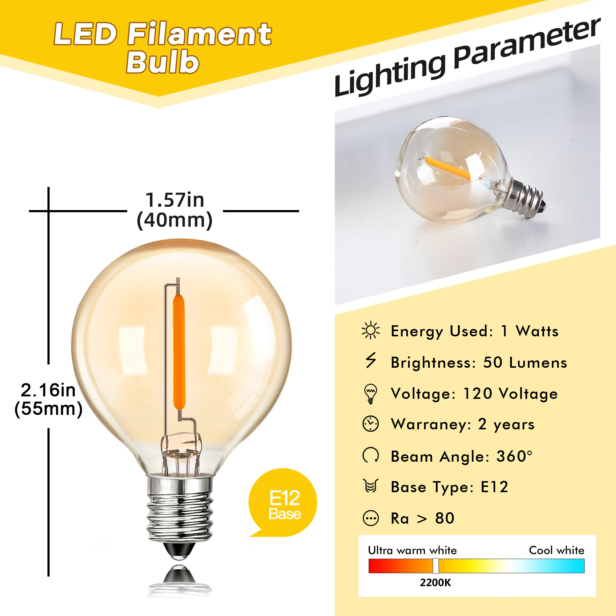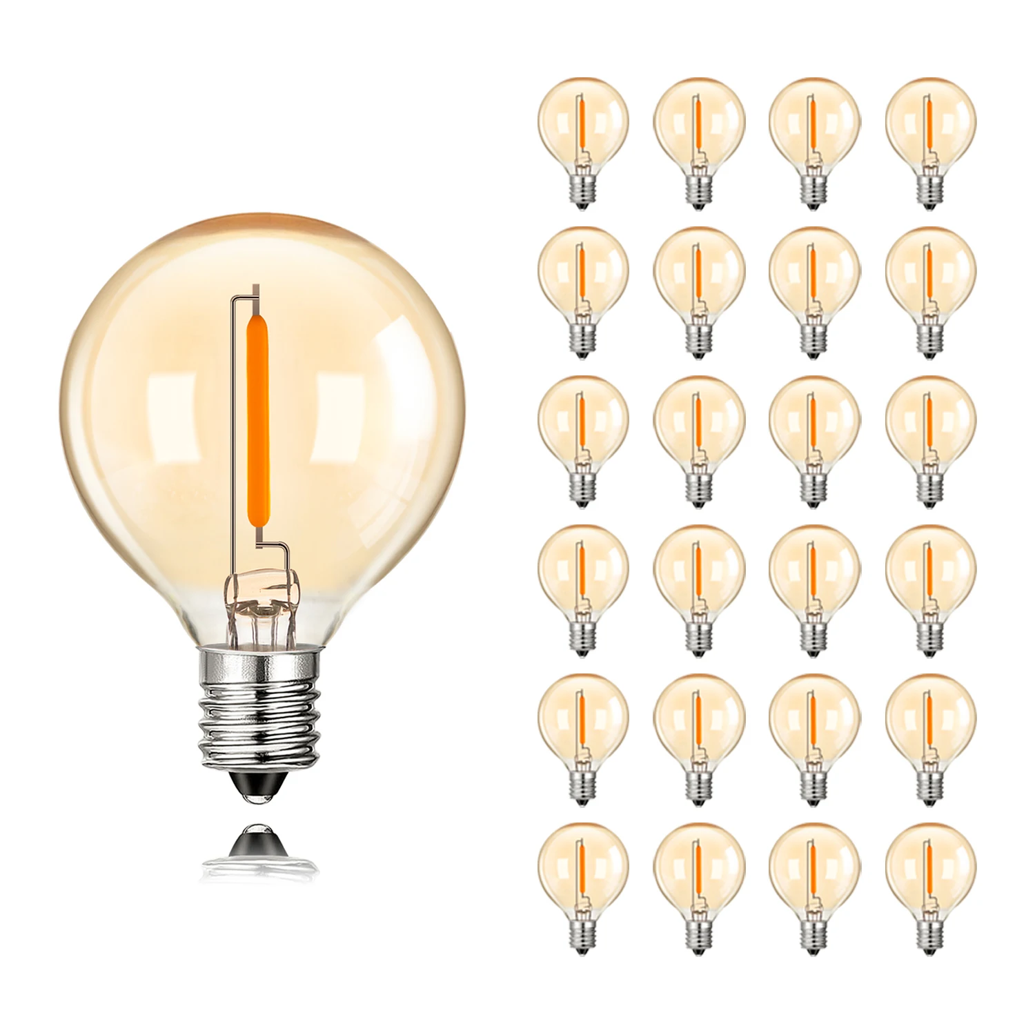 Imagine transforming your space with the warm, inviting glow of this vintage-inspired G40 LED filament bulb. Crafted with a clear, slightly tinted glass that shimmers with a subtle gold hue, it offers an elegant nostalgic aesthetic. Inside, orange-colored LED filaments mimic traditional incandescent filaments, providing a cozy, soft warm light at 2200K. Whether adorning your garden, patio, or indoor decor, these globe-shaped bulbs create an intimate ambiance. Available in 25 or 50-piece sets, they give you versatility for various decoration scales. Their vintage look combined with energy-efficient LED technology makes them perfect for enhancing your environment with style and functionality.