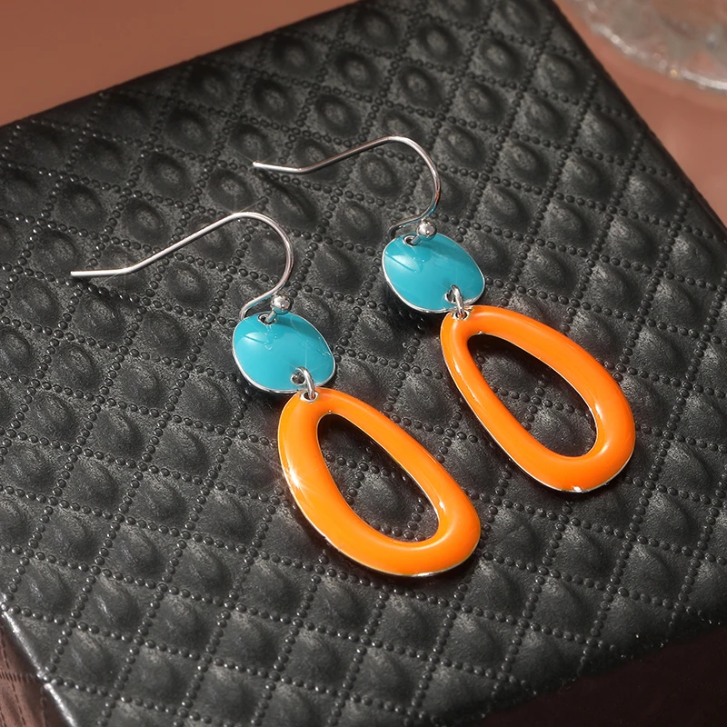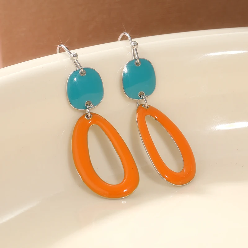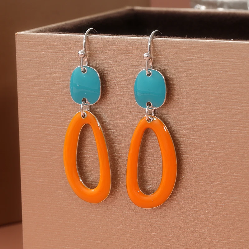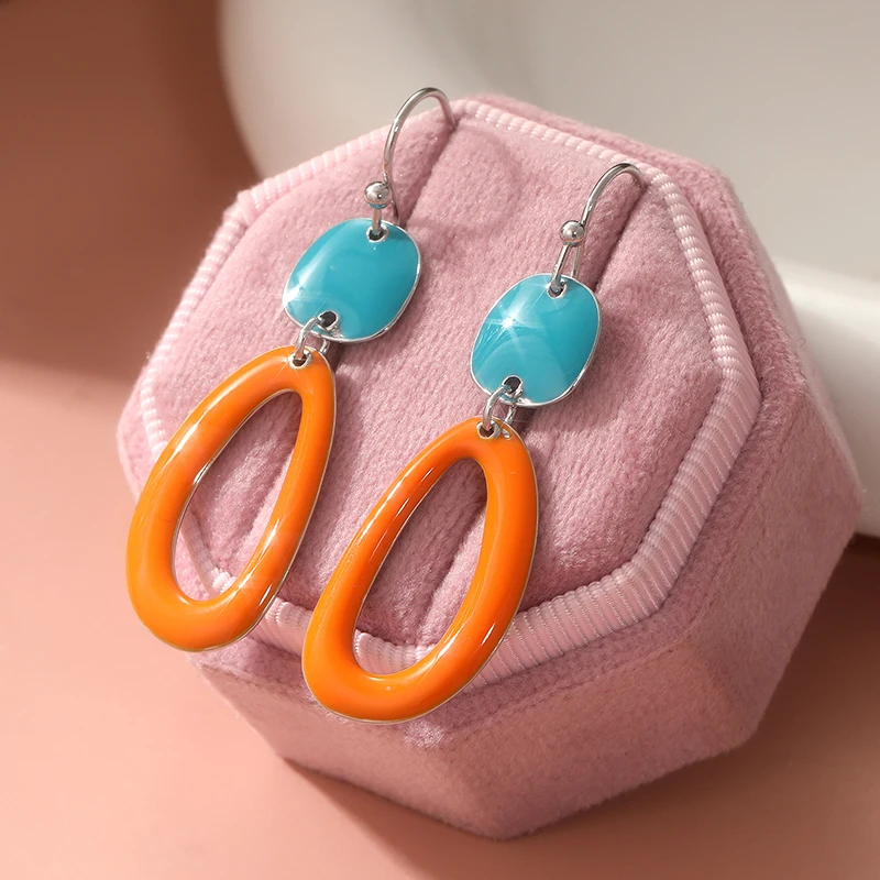Experience the perfect blend of vintage charm and contemporary style with these striking drop earrings. Crafted from copper alloy and finished in a versatile silver tone, they feature a captivating geometric design with matte teal oval components attached to vibrant orange, hollow, elongated oval pendants. The bold color contrast and unique shapes make them an eye-catching accessory for any occasion, whether you’re attending a wedding, celebration, or simply elevating your everyday look. Their lightweight yet durable structure ensures comfortable wear, allowing you to feel confident and stylish all day long. Embrace your individuality with these artistic earrings, which beautifully combine vintage-inspired elegance with modern flair, making them a delightful addition to your jewelry collection.