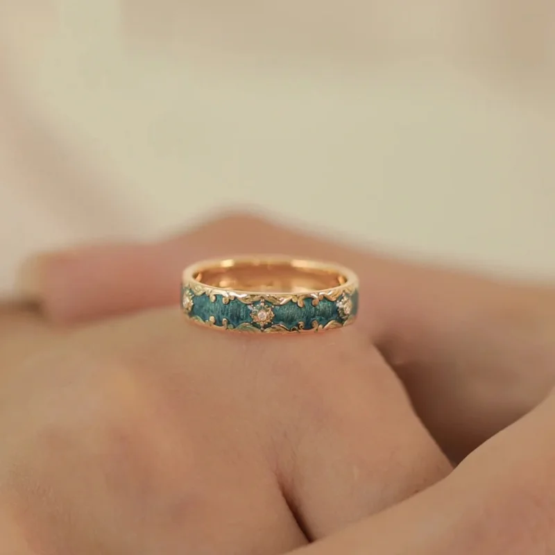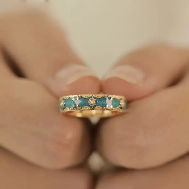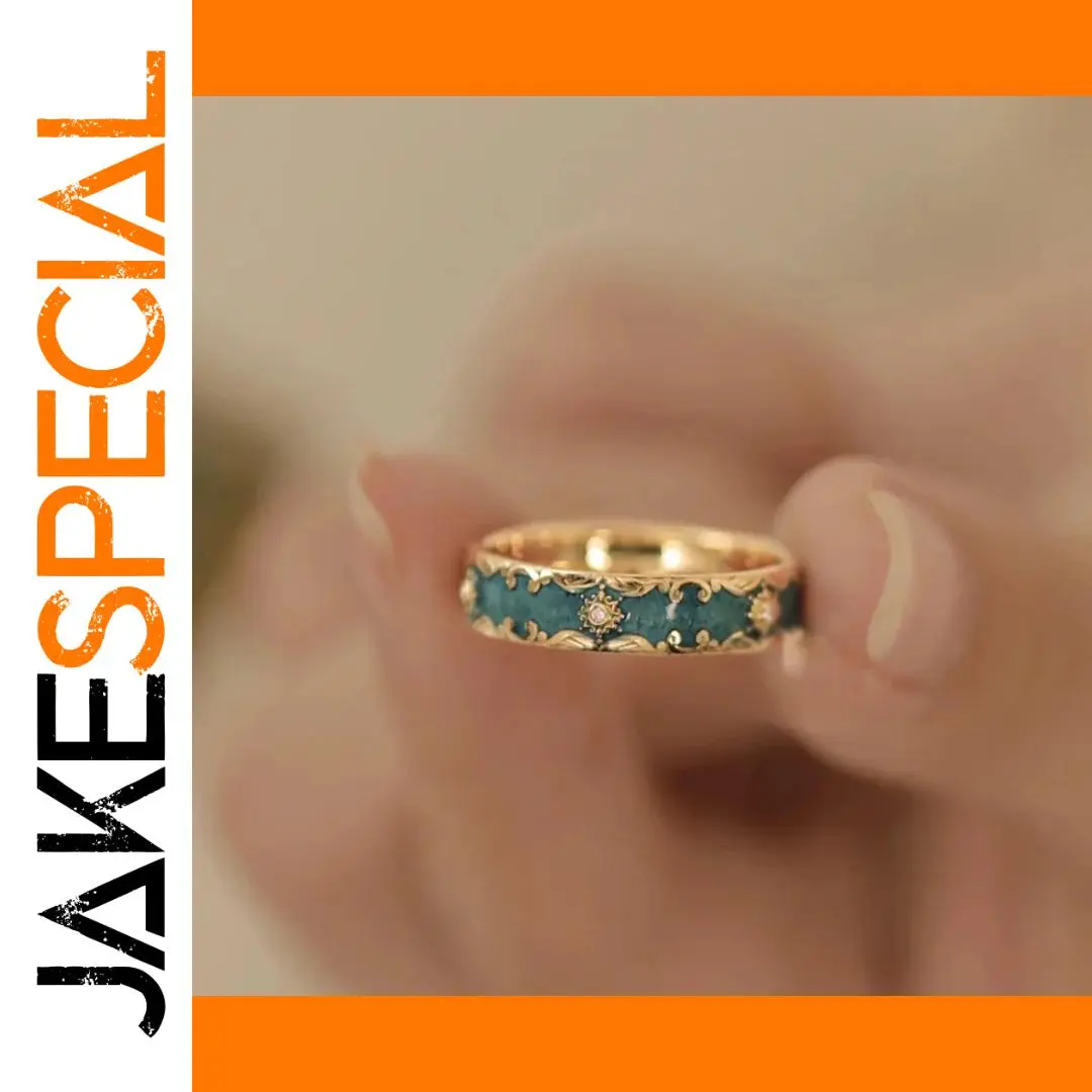Elevate your jewelry collection with this vintage-style geometric pattern ring crafted from gold-colored alloy with an enamel process. Its resizable, flexible design ensures a perfect fit for any finger, making it ideal for parties, weddings, or engagements. Featuring a copper base with a high-quality finish that resists chemical reactions, the intricate teal or turquoise enamel surface is decorated with delicate gold-tone motifs, adding an elegant, artistic touch. Lightweight and versatile, this single-piece ring complements various styles and occasions, offering a sophisticated blend of vibrant color, textured patterns, and refined craftsmanship for an exquisite, timeless look.