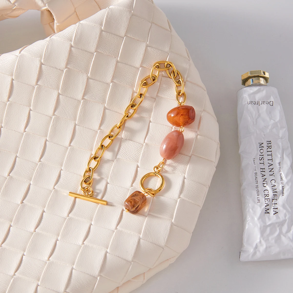 Experience the timeless elegance of this vintage-inspired geometric resin bracelet, designed to elevate your daily style effortlessly. Crafted with a durable stainless steel base coated in luxurious gold, it offers both resilience and sophistication. The bold link chain features elongated oval links that add a sleek, minimalist touch, making it easy to pair with any outfit. Adorning the front are four large, glossy resin beads in warm shades of pink blush, caramel, and deep amber, each reflecting light beautifully for an eye-catching effect. Its artistic geometric shape gives it a unique vintage charm, perfect for both casual daywear and evening occasions. Imagine yourself wearing this versatile piece that enhances your look with organic warmth and refined style every time.