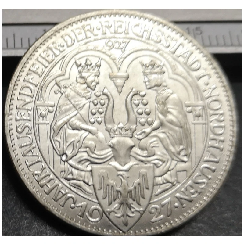 Own a detailed replica of the 1927 Germany-1871-1948 3 Reichsmark from Nordhausen, crafted through casting to embody an antique European style from the 1920-1939 period. Made of metal, this coin features a vintage design with embossed intricate motifs, including a bold central “3” and the inscription “Deutsches Reichsmark” along the rim. Accented with decorative border designs resembling multi-petaled floral or clover patterns and textured ridged edges, it exudes an authentic historical charm. This collectible replica, showcasing detailed embossing and regional European craftsmanship, is perfect for enthusiasts of vintage German motifs and antique coin aesthetics.
