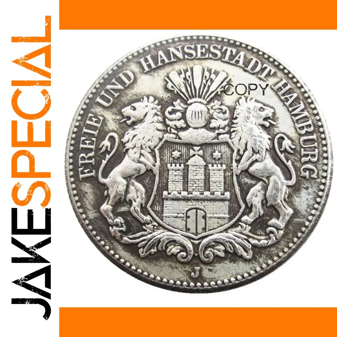 Step into history with this meticulously crafted set of 11 replica German 2 Mark coins from the years 1891 to 1913. Each coin presents a vintage, nostalgic aesthetic with a slightly aged, patinated metallic finish that evokes the charm of antique currency. The detailed relief work features a heraldic shield, flanked by regal lions with prominent manes, symbolizing strength and heritage. Surrounding the central design is an inscription reading “FREIE UND HANSESTADT HAMBURG,” emphasizing the city's historical importance. The coins are adorned with a beaded border, adding luxurious craftsmanship to these intricate replicas. Perfect for history buffs and collectors who appreciate detailed, patriotic nostalgia from late 19th and early 20th-century Germany.
