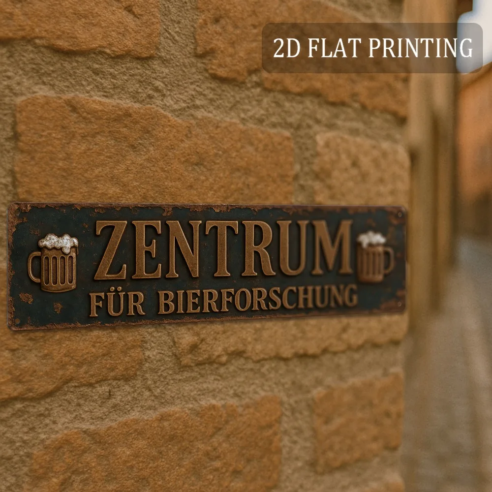 Add a touch of vintage charm to your space with this 40 cm by 10 cm (16 x 4″) aluminum sign, featuring a distressed, rustic finish that exudes nostalgic appeal. Designed as a humorous German brewery decor piece, it highlights the theme “ZENTRUM FÜR BIERFORSCHUNG” with bold, relief serif lettering in a metallic gold or bronze hue, flanked by playful beer mug icons. Made from durable aluminum, this sign is perfect for bars, pubs, cafes, restaurants, or home man caves. Its weathered look and authentic style make it an eye-catching decoration that effortlessly combines humor and vintage flair to enhance your existing decor.