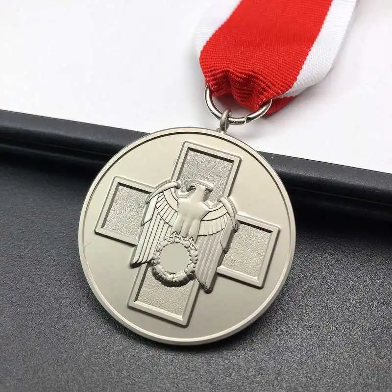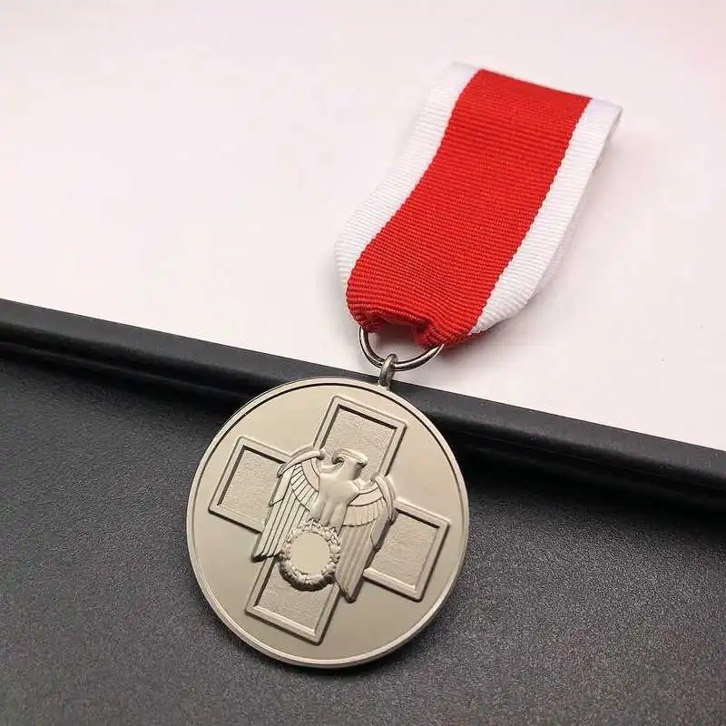 Imagine owning a piece of history with this beautifully crafted vintage medal. Made of shiny copper, it exudes a nostalgic charm that transports you to a bygone era of European design. The round shape features intricate embossed details, including bold, three-dimensional text that reads “Medaille für treue Dienchte” and “Gourpfleger” on the front. The back displays a prominent embossed cross with a central emblem of an eagle with outspread wings, symbolizing strength and honor. Attached to a striped ribbon with a vibrant red center bordered by white edges, this medal adds a regal, commemorative touch to any collection. Its vintage aesthetic makes it ideal for display or as a meaningful tribute to history and social welfare.