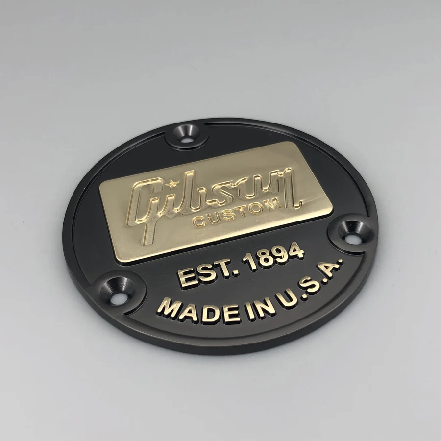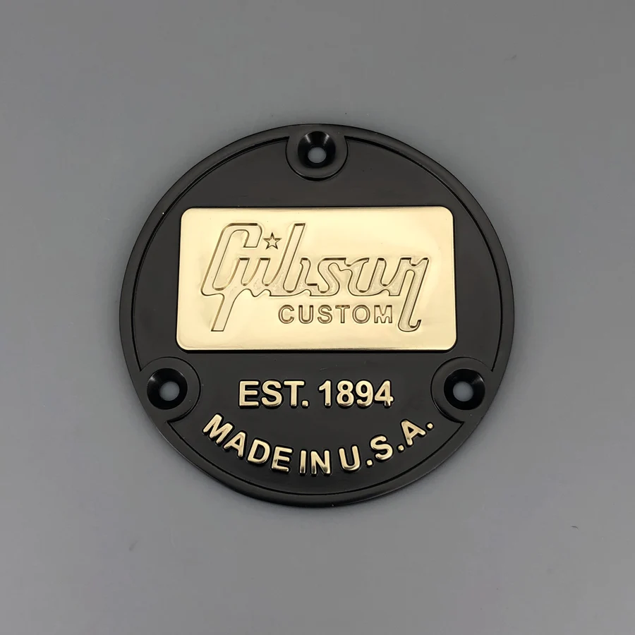 Experience the timeless charm of this vintage-style Gibson switch cover plate, specially designed to elevate the look of your guitar. Crafted from durable metal, this round plate features a sleek black metallic finish that exudes classic elegance. The embossed inscription “Gibson” in a stylized script, along with “CUSTOM,” adds a sophisticated touch, complemented by the creamy illuminated rectangular inset at the center. The inscription “EST. 1894” and “MADE IN U.S.A.” are elegantly curved along the bottom, emphasizing its heritage and craftsmanship. With a diameter of 54 mm and a 3 mm thickness, this sturdy accessory seamlessly fits various Gibson models. Enhance your guitar with a piece that embodies quality, nostalgia, and style, making it the perfect upgrade for any enthusiast seeking a vintage aesthetic.