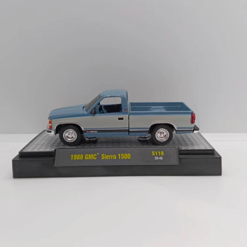 Elevate your collection with this highly detailed 1/64 scale diecast model of the 1988 GMC Sierra 1500 pickup truck, crafted from alloy and plastic. Featuring a striking two-tone blue paint job with a darker blue stripe, this model captures the vintage’s boxy design, detailed hood, tinted windows, molded headlights with red indicator lenses, GMC grille, and realistic silver wheels with black tires. Perfect for display, gifting, or decorating your space, this finished static model measures approximately 1/64 in scale and is designed for collectors aged 14 and above. No batteries or electrical parts are included, emphasizing its quality craftsmanship and nostalgic appeal.