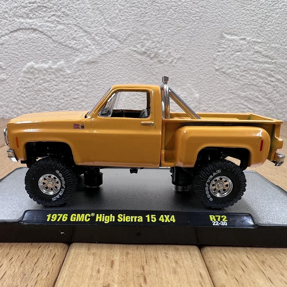 Immerse yourself in the vintage charm of this meticulously crafted die-cast model of the GMC 1976 Sierra Pickup. Sized at 1:64 scale, approximately 9 centimeters long, it features a beige or tan body accented with chrome details, providing a rugged and timeless aesthetic. Its realistic design includes a sturdy front grille with chrome highlights, a silver bumper guard, rectangular headlights, and clear, detailed windows revealing a simple interior. The flat truck bed exhibits subtle ridges, enhancing authenticity. Equipped with black off-road tires with deep treads and silver rims, this model captures the rugged spirit of off-road vehicles. Perfect for collectors seeking a nostalgic, detailed display piece or a unique gift to share your passion for vintage trucks.