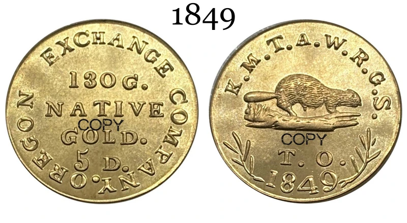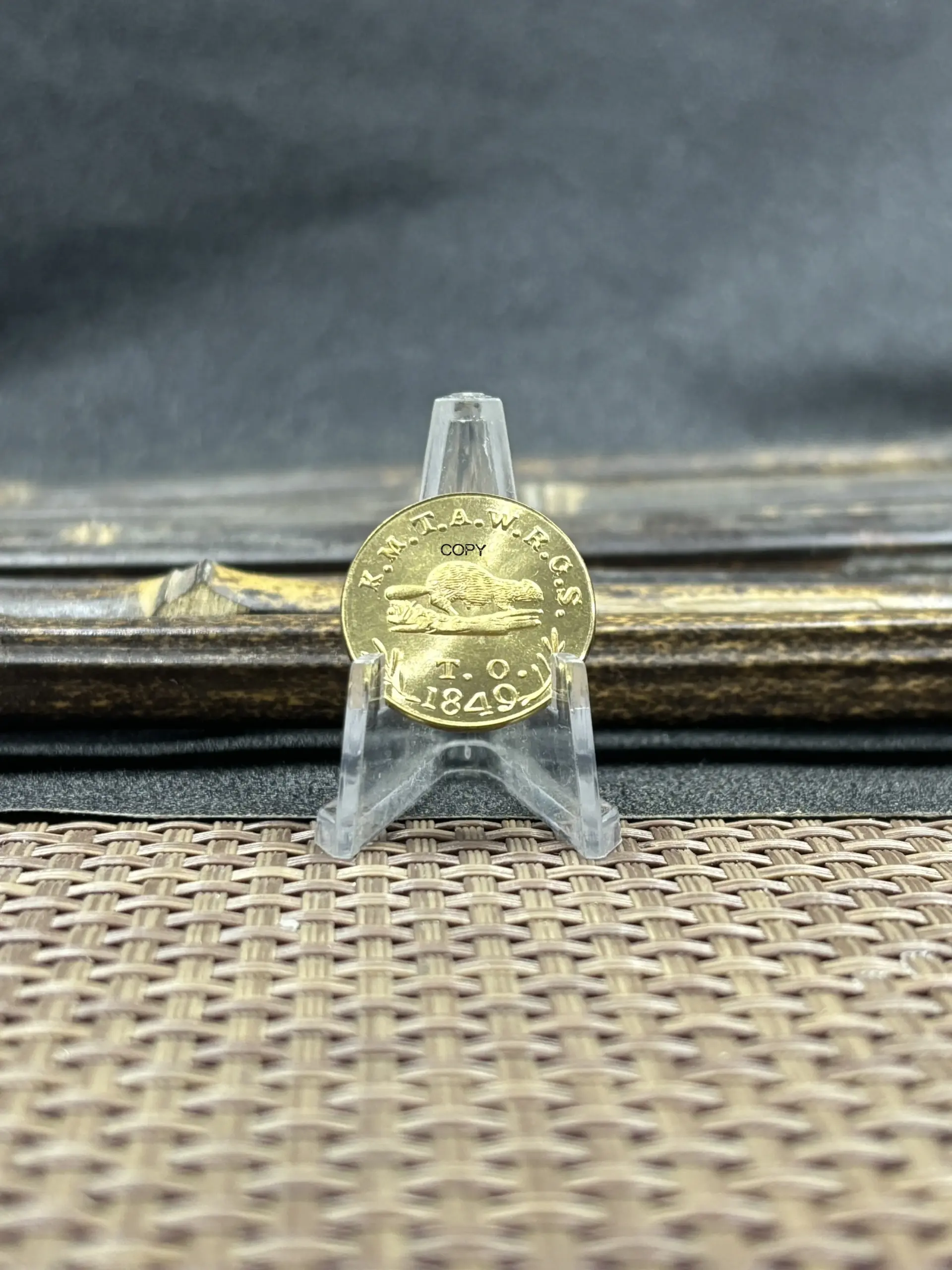 Imagine adding this stunning vintage coin replica to your collection, each detail crafted to evoke the charm of 19th-century American tokens. Made from high-quality metal with an antique gold finish, this coin boasts a textured, matte surface that highlights its aged appearance. The high-relief design showcases a beaver in profile, complete with textured fur, a flat tail, and a rounded body, set against a subtle ground line for realism. Encircling the beaver is a circular text band with the inscription “K. M. T. A. W. R. G. S.,” complemented by decorative laurel branches at the lower corners, adding elegance and balance. Its vintage aesthetic blends craftsmanship with historical authenticity, making it an eye-catching display piece. Perfect for collectors seeking a unique and authentic addition to their vintage coin lineup.