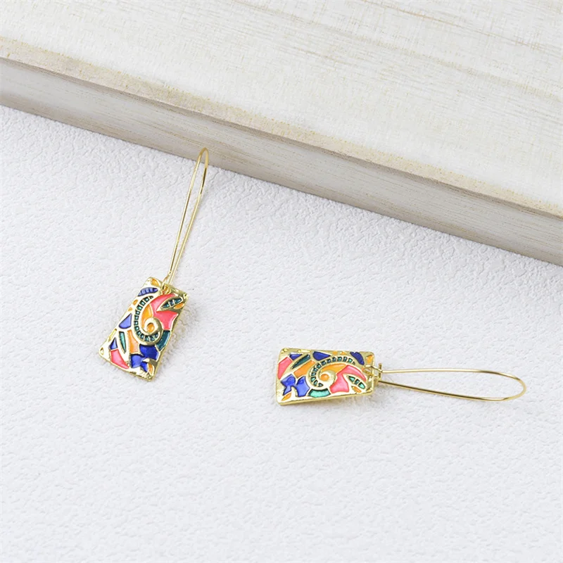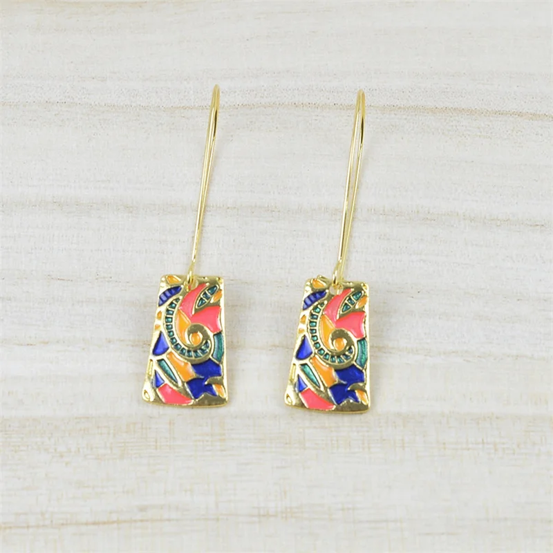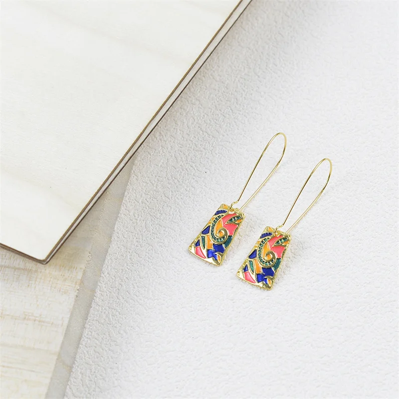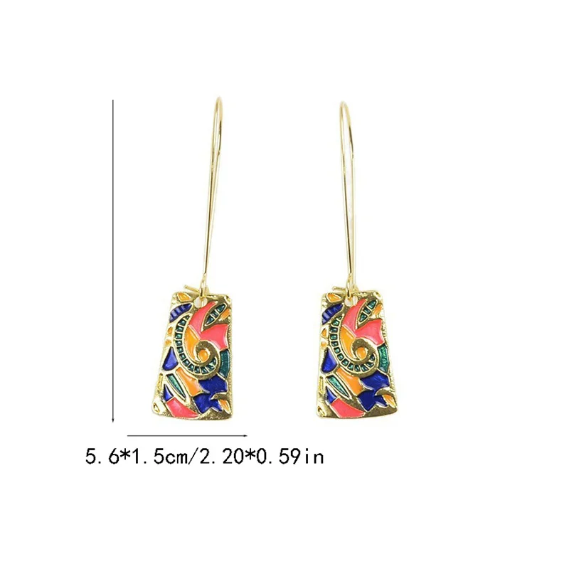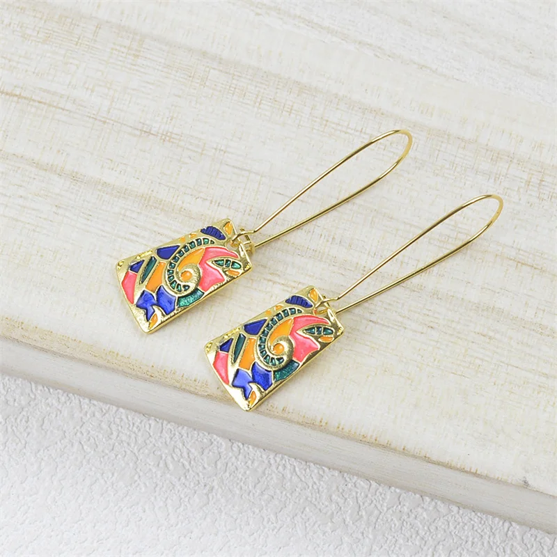 Experience timeless elegance with these vintage-style drop earrings crafted from zinc alloy with a luxurious gold-colored finish. Featuring a rectangular shape with intricate geometric patterns, each earring showcases swirling, abstract motifs in vibrant enamel colors, including pink, green, blue, orange, and gold. Designed for women and girls, they hang gracefully from slender hooks, making them perfect for parties, weddings, anniversaries, or everyday wear. These lightweight, versatile accessories are free of high concern chemicals, ensuring both beauty and safety for any occasion. Elevate your style with these colorful, artistic earrings that add a touch of sophistication and vintage charm to your look.