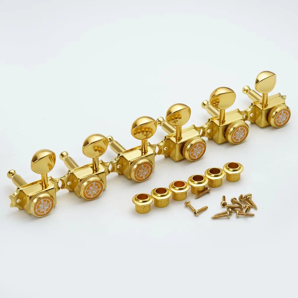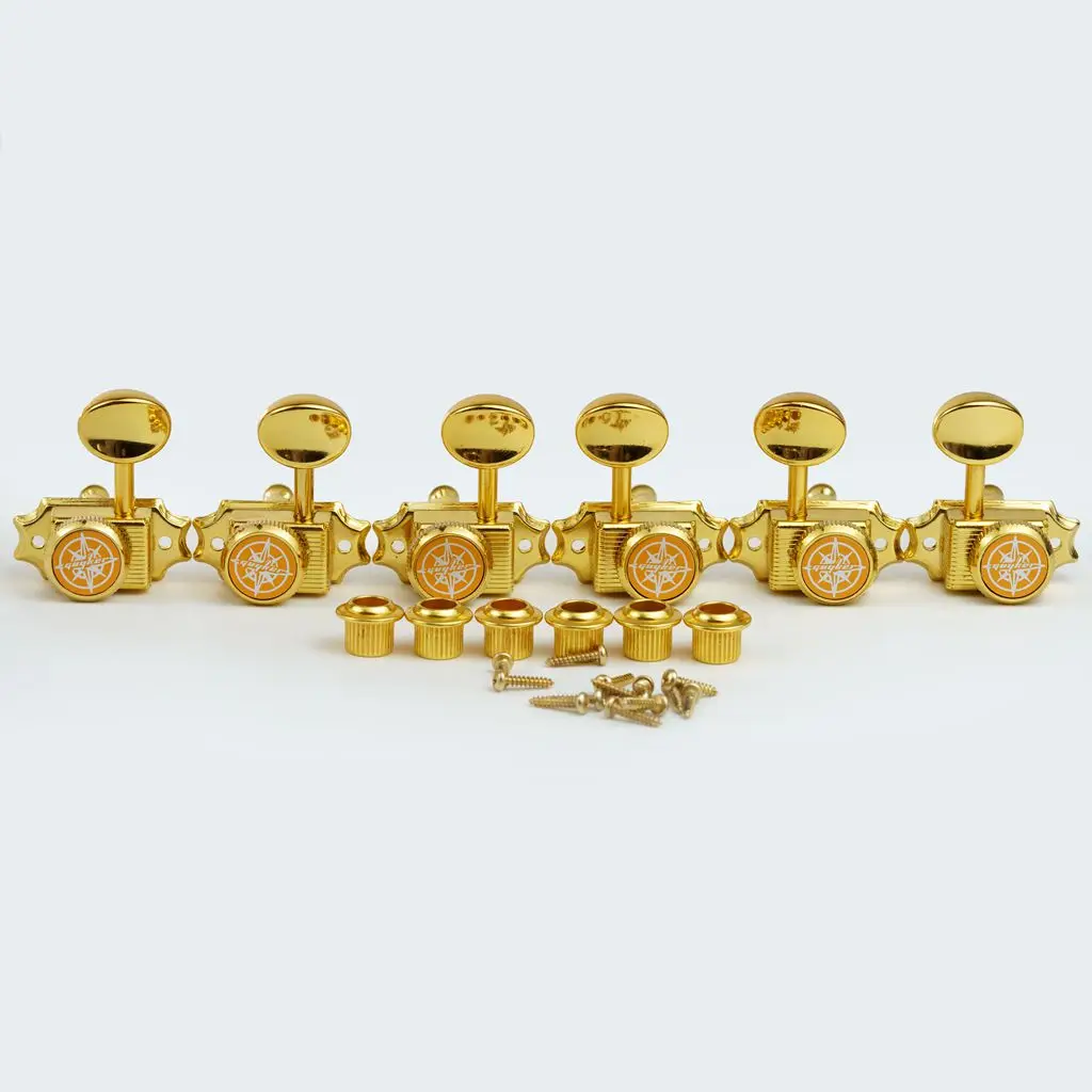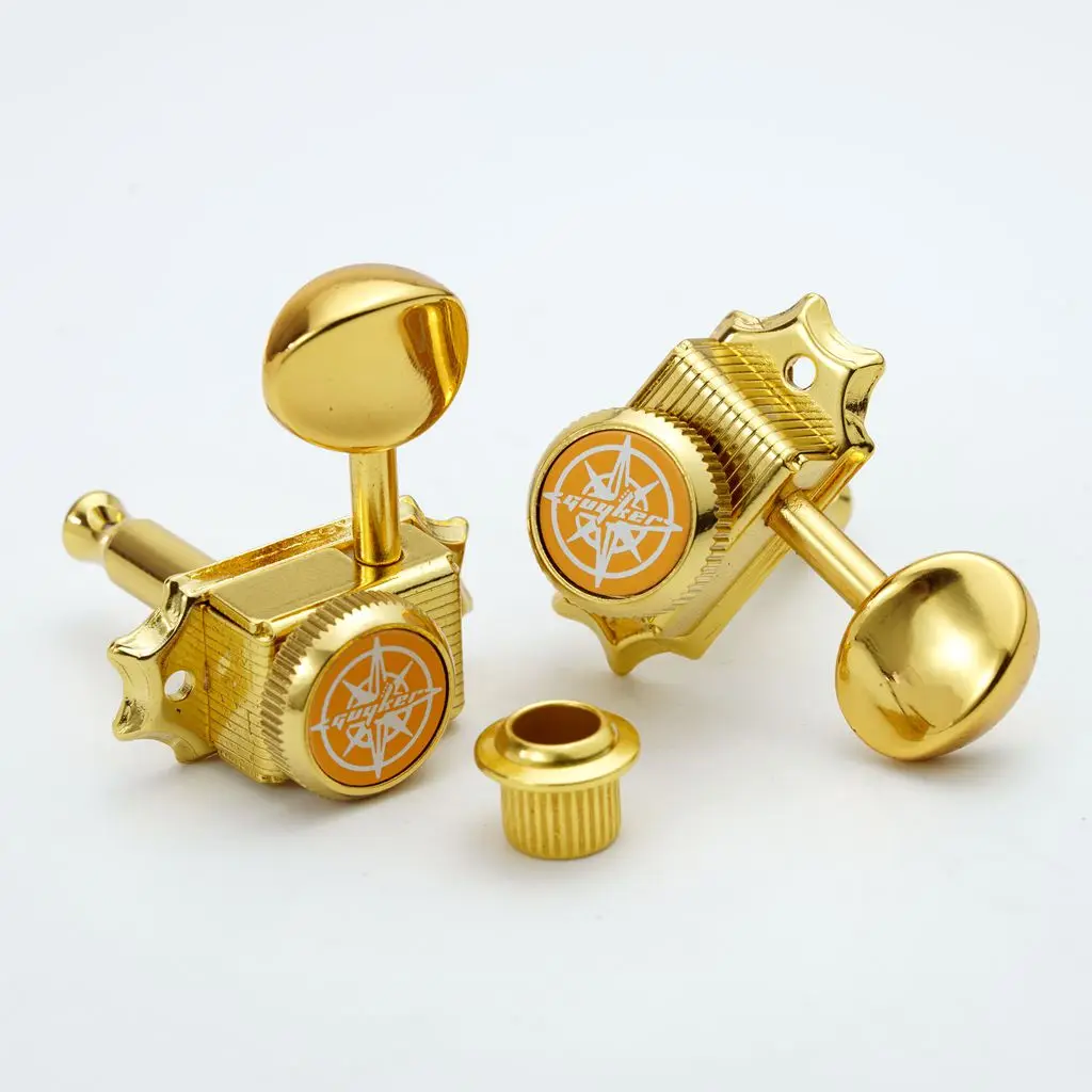 Enhance your musical instrument with this set of three vintage-style gold lock string tuners, model GK45GSP. Crafted entirely from metal for durability, these tuning machines feature a luxurious gold finish, large oval-shaped tuning keys with a polished, reflective surface, and decorative square bases with intricate grooves and side details. Each tuner includes a white circular emblem with a star motif, adding a vintage aesthetic. Designed for reliable performance on stringed instruments, these tuners are perfect for restoring or customizing your guitar or other stringed instrument, bringing a classic, elegant look that combines craftsmanship with functionality.