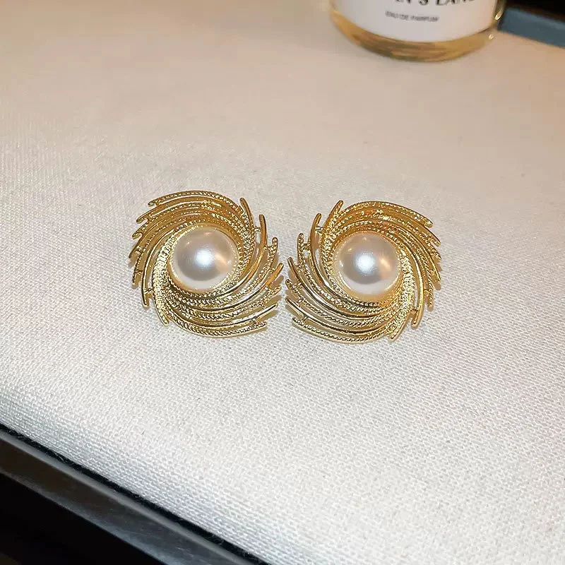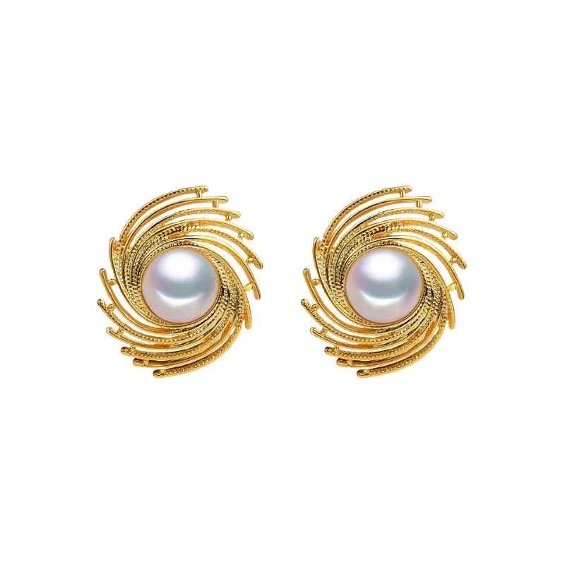 - The design features a luminous simulated pearl at the center, surrounded by swirling metallic ridges forming a dynamic geometric pattern, evoking elegance and artistic finesse.