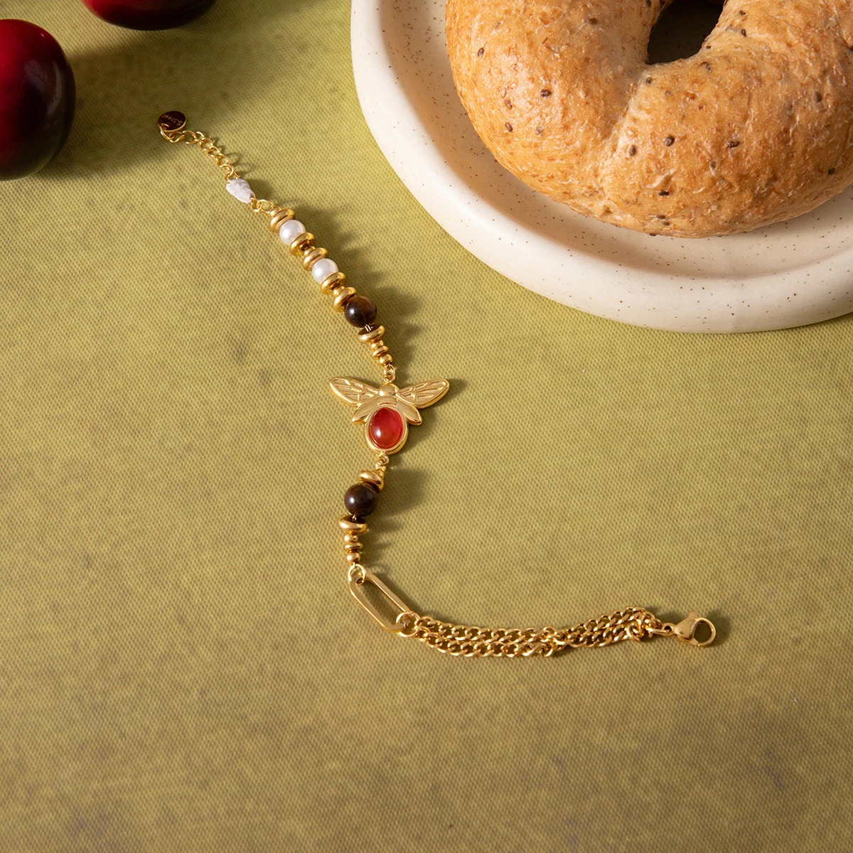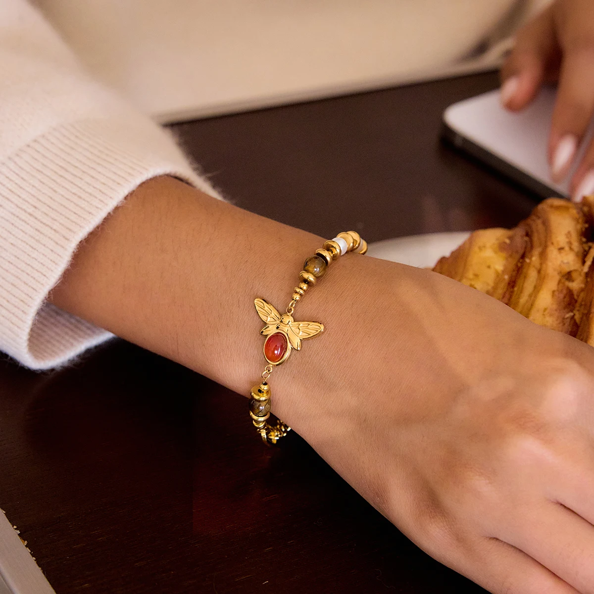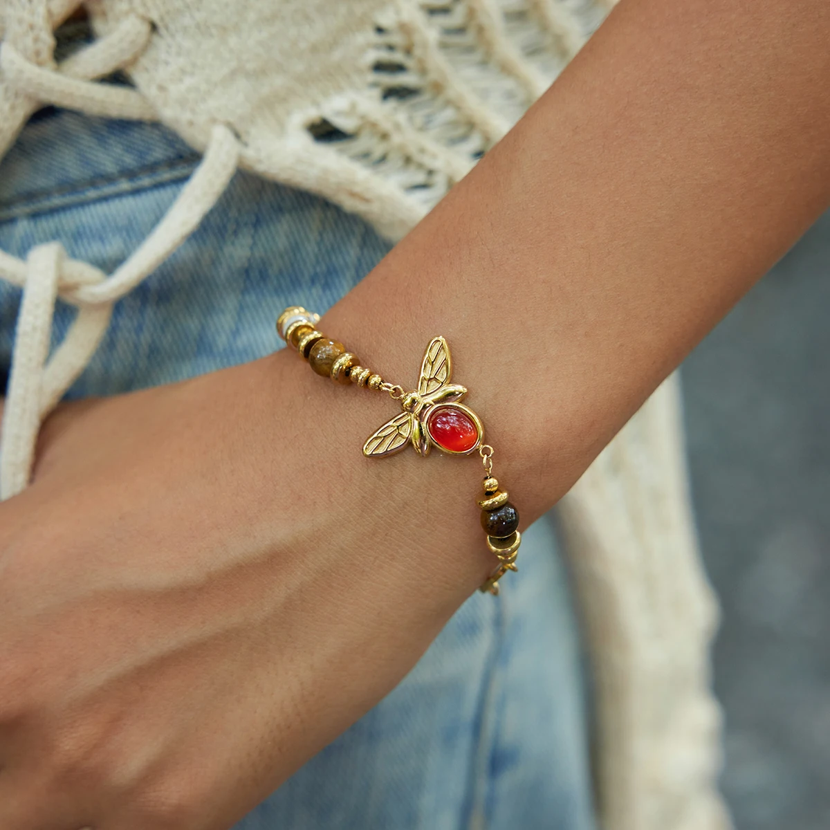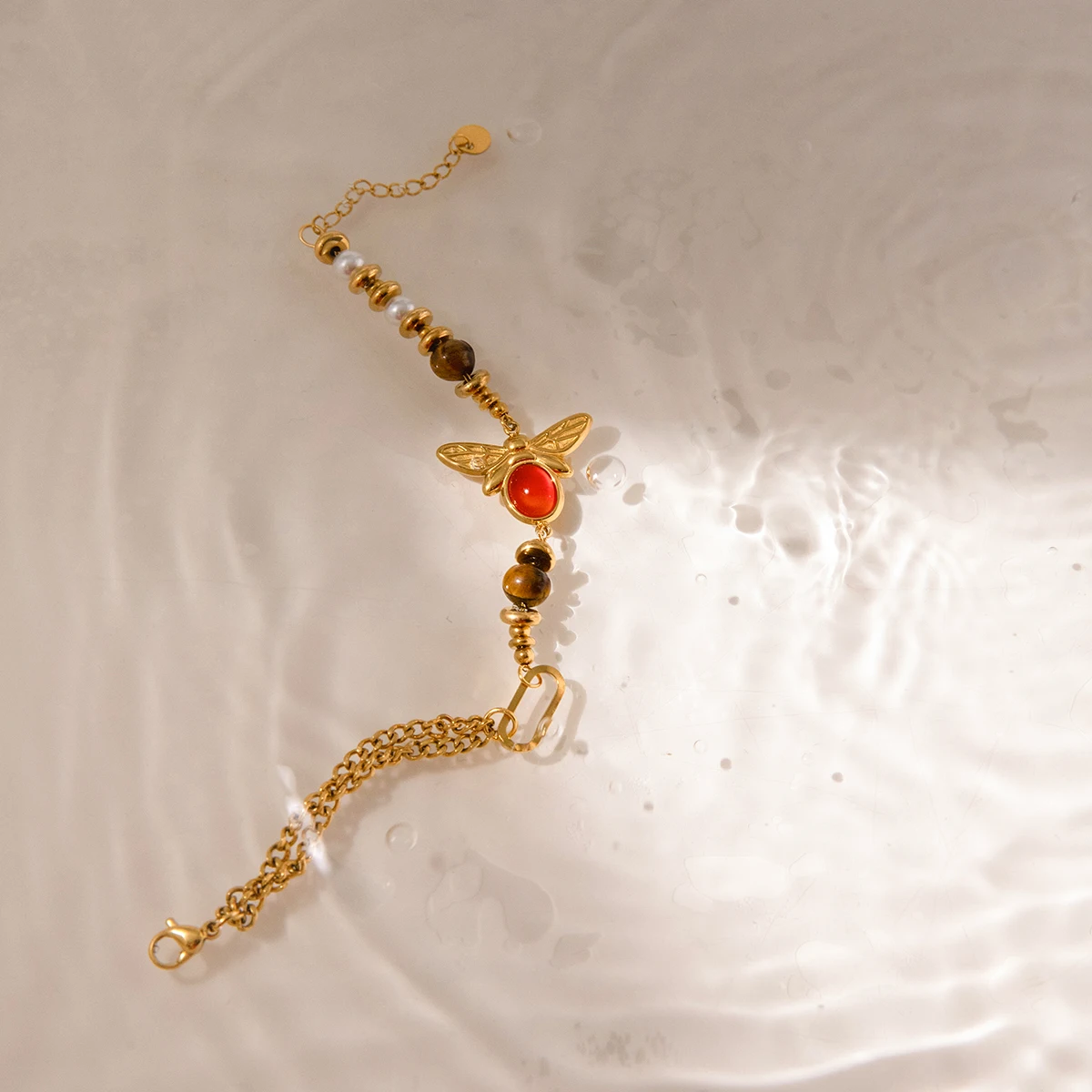 Experience timeless elegance with this vintage-inspired bracelet, crafted from durable stainless steel in a luxurious gold tone. The beaded chain-link design features a harmonious arrangement of polished round beads in dark brown tiger's eye, white pearls, and vibrant red agate, creating a charming and versatile accessory. The intricate channel setting showcases these natural stones, accentuated by the detailed, gold-toned bee charm with etched wings and body, highlighted by a glossy red oval stone. With its easy-hook clasp, this bracelet offers a secure and adjustable fit for all-day comfort. Perfect for adding an elegant, nature-inspired touch to any outfit, it embodies refined craftsmanship and vintage style for the modern woman.