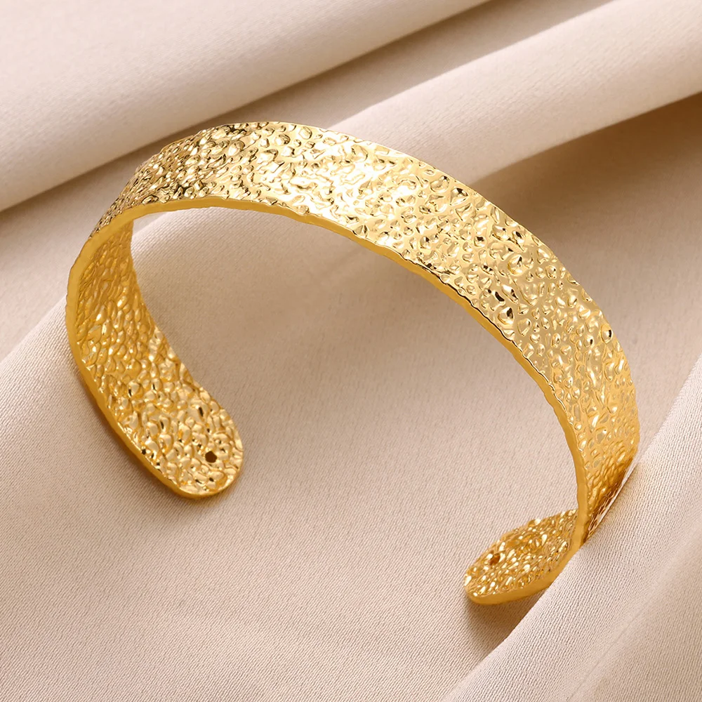 Experience the allure of this exquisite vintage-inspired cuff bracelet, designed to elevate your everyday look with its bold yet minimalist aesthetic. Crafted from high-quality stainless steel with a luminous gold-tone finish, this accessory boasts a polished, mirror-like surface that reflects light beautifully, adding a touch of luxury to any outfit. Its wide, flat shape features a slightly irregular, geometric pattern, giving it a modern vintage vibe. The smooth, curved profile ensures comfortable wear, while the open cuff design allows easy adjustment to fit various wrist sizes. Whether worn casually or for special occasions, this piece makes a confident statement. Perfect for trend-conscious individuals who appreciate timeless yet contemporary jewelry.