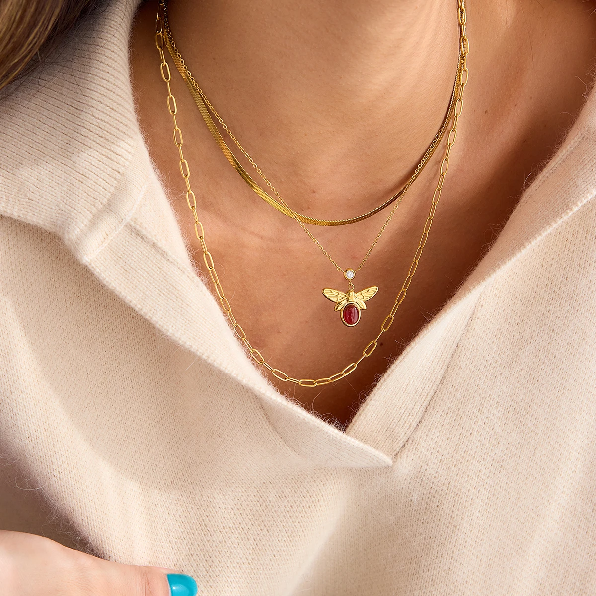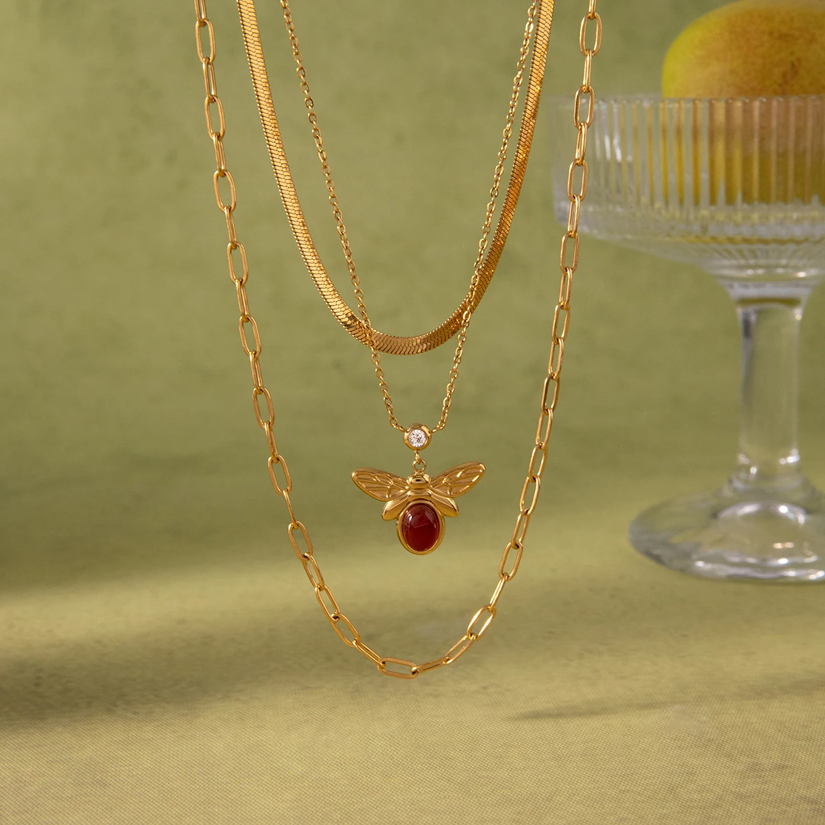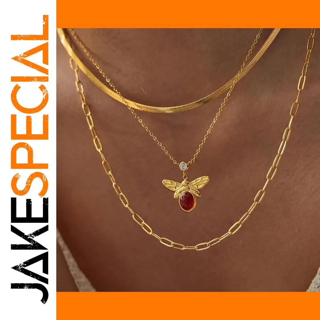 This vintage-inspired, three-layer stainless steel necklace features a striking gold-colored PVD finish, perfect for party occasions. The stack includes a sleek, flat herringbone chain, a delicate fine link chain, and a thicker elongated rectangular link chain. At the center, an eye-catching bee pendant showcases an oval-shaped red agate stone, intricately engraved wings, and a small zircon accent for added sparkle. Designed for women, this pendant necklace combines timeless charm with modern style, offering a versatile accessory suitable for all outfits. Its high-quality materials ensure durability and elegance, making it a captivating addition to your jewelry collection.