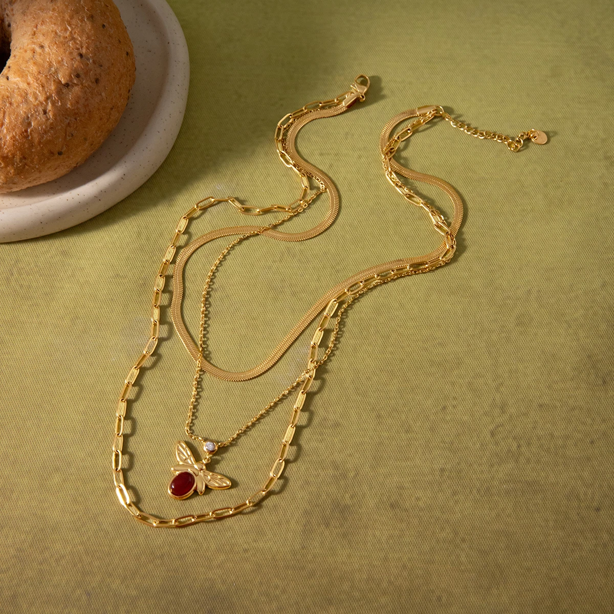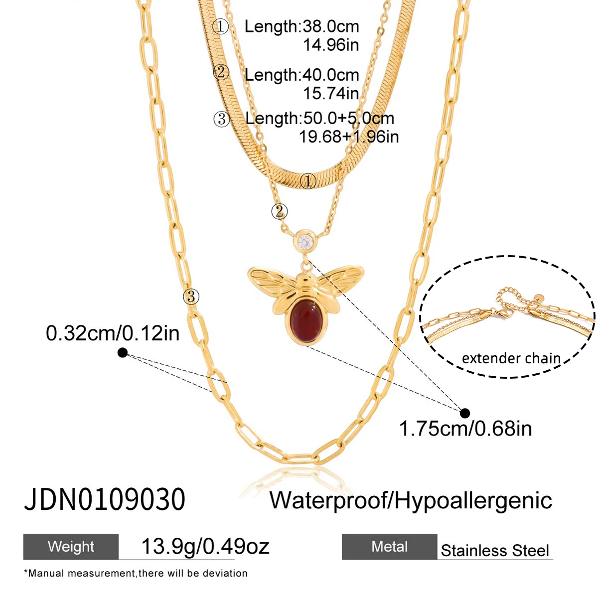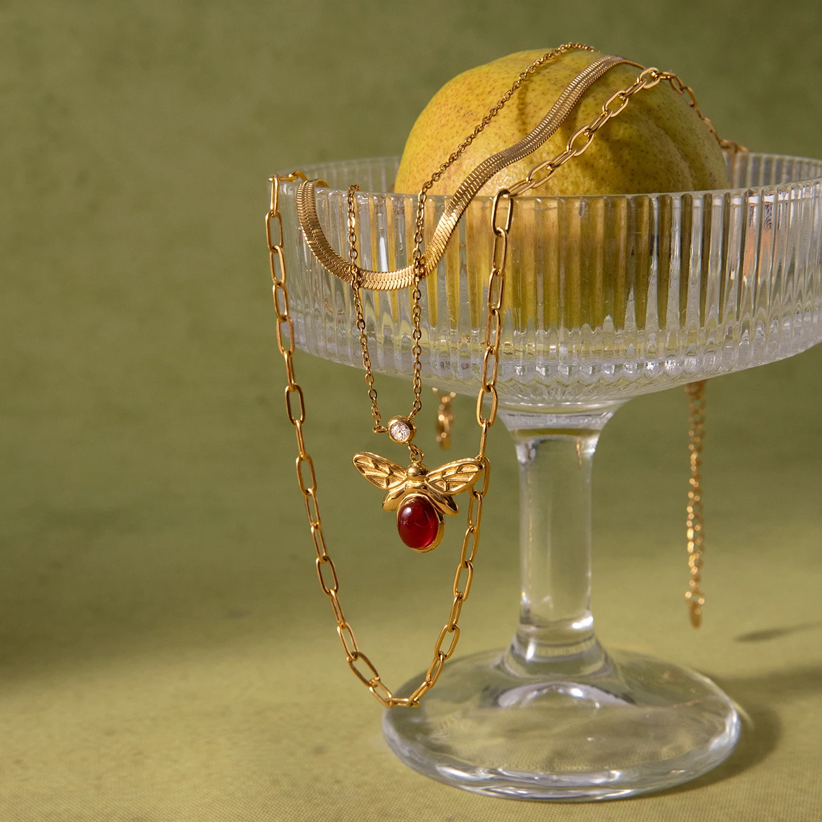 This vintage-inspired, three-layer stainless steel necklace features a striking gold-colored PVD finish, perfect for party occasions. The stack includes a sleek, flat herringbone chain, a delicate fine link chain, and a thicker elongated rectangular link chain. At the center, an eye-catching bee pendant showcases an oval-shaped red agate stone, intricately engraved wings, and a small zircon accent for added sparkle. Designed for women, this pendant necklace combines timeless charm with modern style, offering a versatile accessory suitable for all outfits. Its high-quality materials ensure durability and elegance, making it a captivating addition to your jewelry collection.