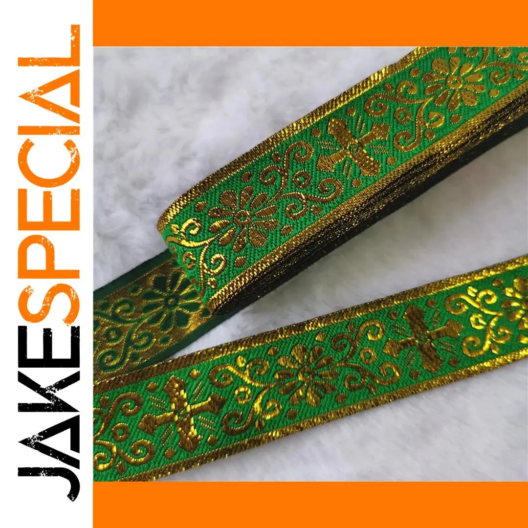 Elevate your craft projects with this exquisite 7-meter long ribbon, featuring a 25mm width that showcases a rich green base beautifully complemented by intricate gold embroidery. The detailed floral patterns and swirls, along with elegant cross motifs, create a stunning visual that embodies a vintage ethnic charm. Finished with gold threading along the edges, this flexible and durable decorative webbing made from a spandex and polyester blend is perfect for enhancing garments, bags, and home textiles. Let this ribbon transform your DIY projects into works of art that reflect your unique style and creativity.