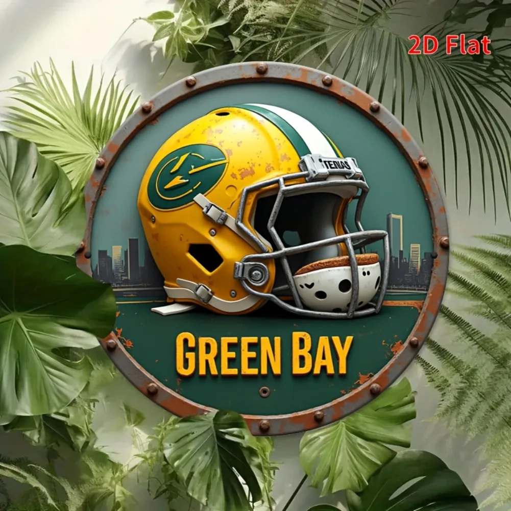 Transform your space with this vintage Green Bay Packers wall sign that captures the nostalgic spirit of football history. Made from durable aluminum, it features a stunning 8×8 inch round design with a rustic green matte background that perfectly complements the weathered, industrial look. The center displays a highly detailed, three-dimensional depiction of a classic Green Bay Packers football helmet in bright yellow, adorned with the iconic green logo, offering a realistic worn-in aesthetic. The upper rim is rust-colored with small rivets for an authentic vintage feel, while the bold “GREEN BAY” lettering at the bottom adds a striking contrast. Subtle silhouettes of the Green Bay skyline in the background enhance the theme, making this decor a perfect tribute for sports fans and collectors alike.