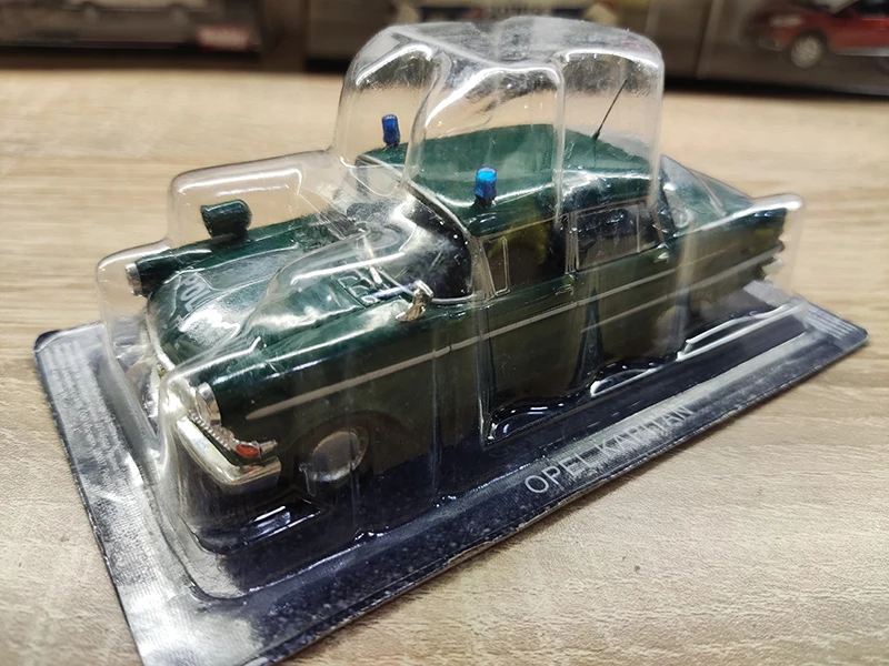 Bring a touch of vintage elegance to your collection with this 1:43 scale diecast model of the Opel Kapitan. Crafted from zinc alloy, plastic, and rubber, it features four turnable wheels and detailed chrome accents on the bumper, grille, and side mirrors. Sitting with a sleek dark green body reminiscent of classic police cars, it showcases a vintage sedan design with smooth, rounded surfaces and transparent windows outlined in black. Small blue police lights on the roof and a black antenna add authentic detail. Perfect for display in home, office, or bar environments, this model offers an elegant, nostalgic aesthetic suitable for enthusiasts and collectors aged 14 and above.