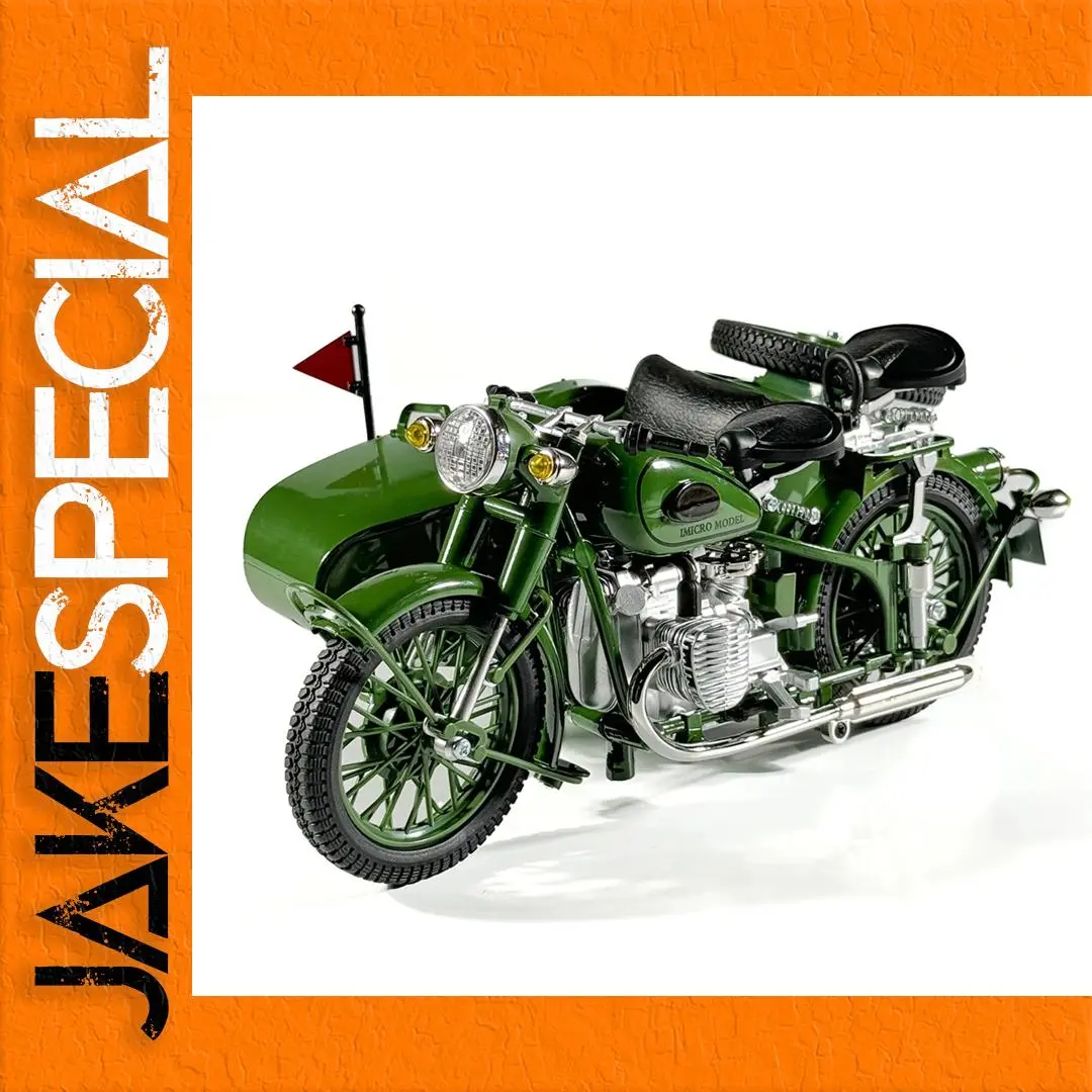 - The model features a striking matte green finish covering the body, fenders, and sidecar, capturing a classic vintage aesthetic that stands out on display.