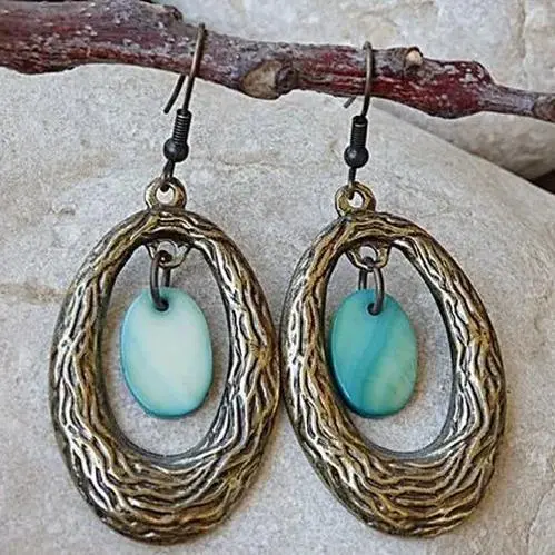 Experience the timeless charm of this vintage-inspired pair of drop earrings, beautifully designed to elevate your style on any occasion. Crafted from zinc alloy with a silver color finish, these earrings feature an intricately textured, irregular oval metal frame with a warm, handcrafted look. Inside the frame, a smooth, polished oval green stone with a marbled gradient of light blue, turquoise, and white adds a soft pastel touch, blending vintage elegance with modern color. Their lightweight yet substantial design offers comfort and sophistication, making them perfect for parties, weddings, engagements, anniversaries, or daily wear. Let these earrings become your favorite accessory, effortlessly enhancing your outfits with charm and personality.