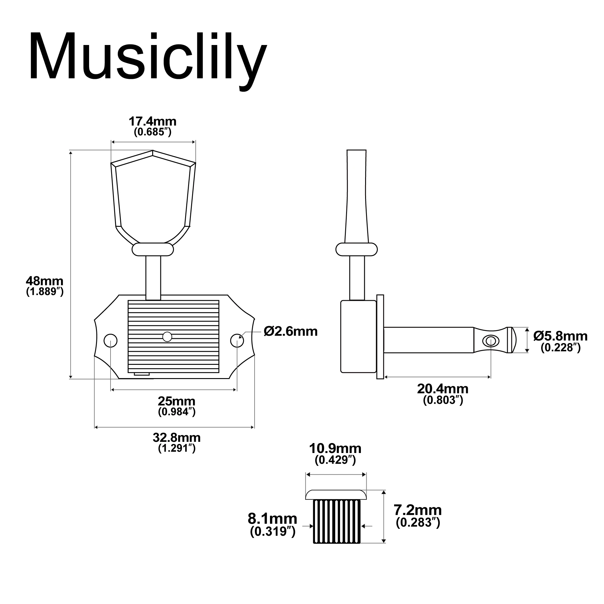 Transform the look and tuning stability of your guitar today with this exceptional set of vintage-style machine heads. Whether you're restoring a classic instrument or customizing your guitar for a more cohesive aesthetic, these tuners deliver both style and function. Their quality construction and precise gear ratio make tuning effortless and long-lasting, giving you confidence in your instrument's performance. Add these to your guitar today and enjoy improved tuning stability, vintage appeal, and reliable craftsmanship that elevates your playing experience. Don’t miss out—upgrade your guitar now!