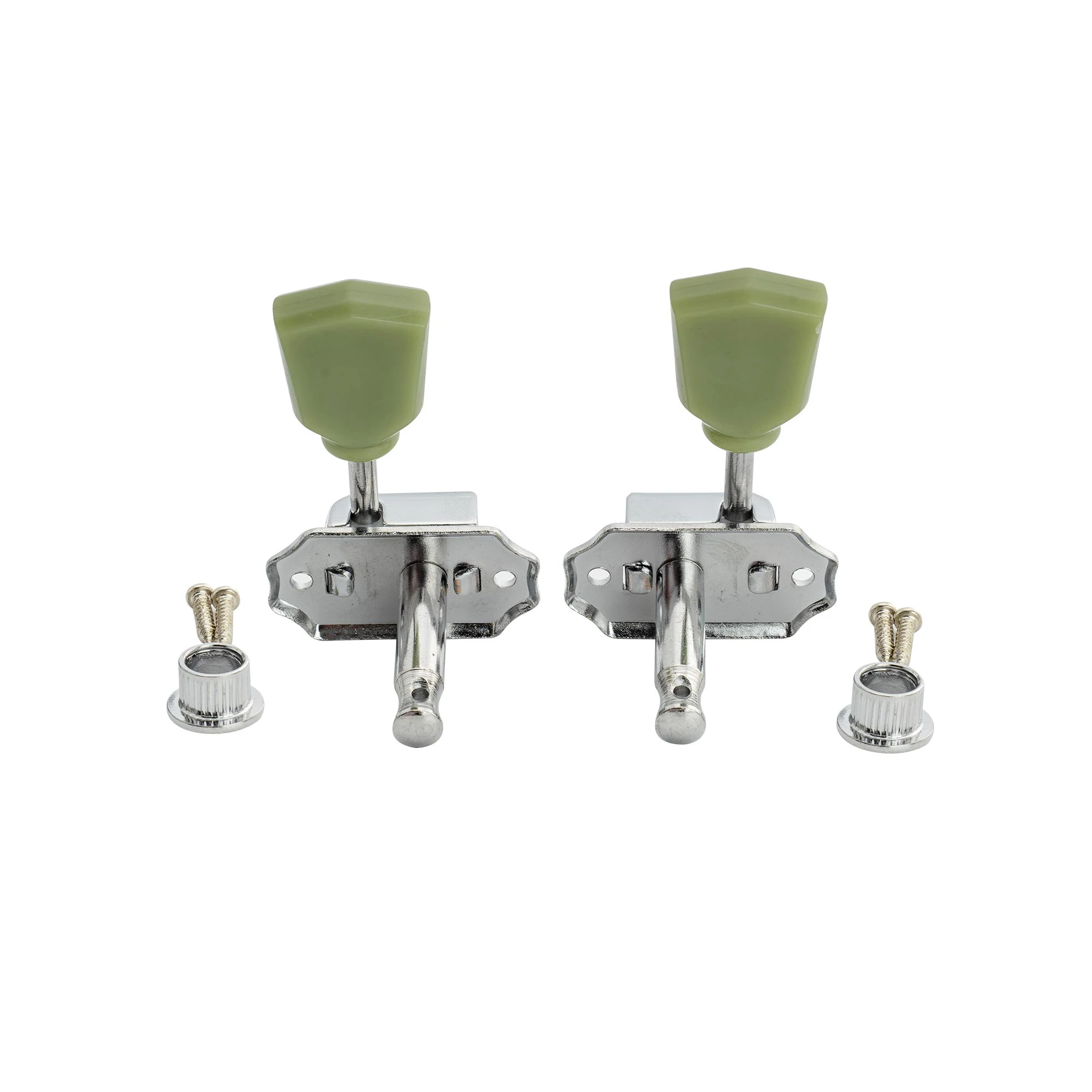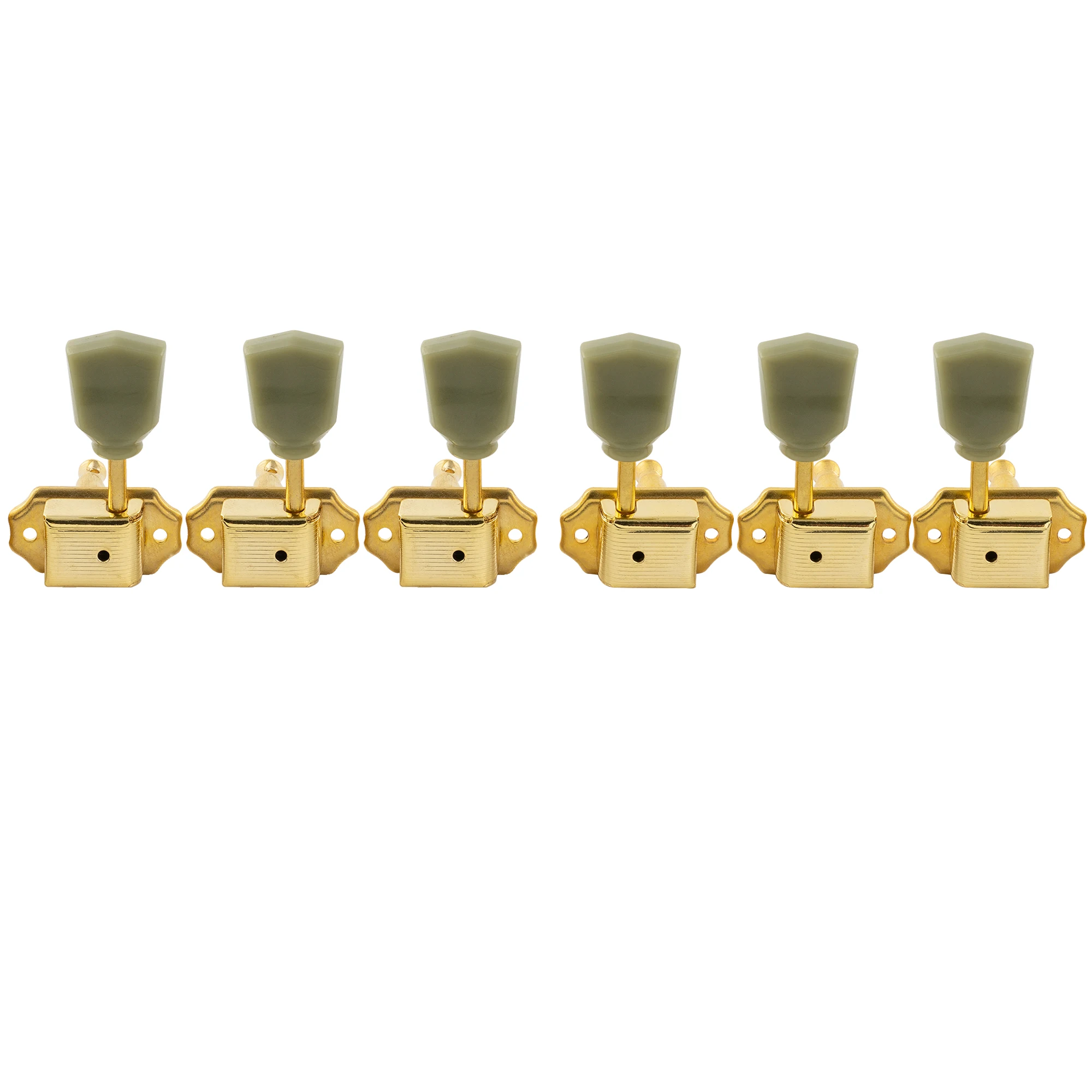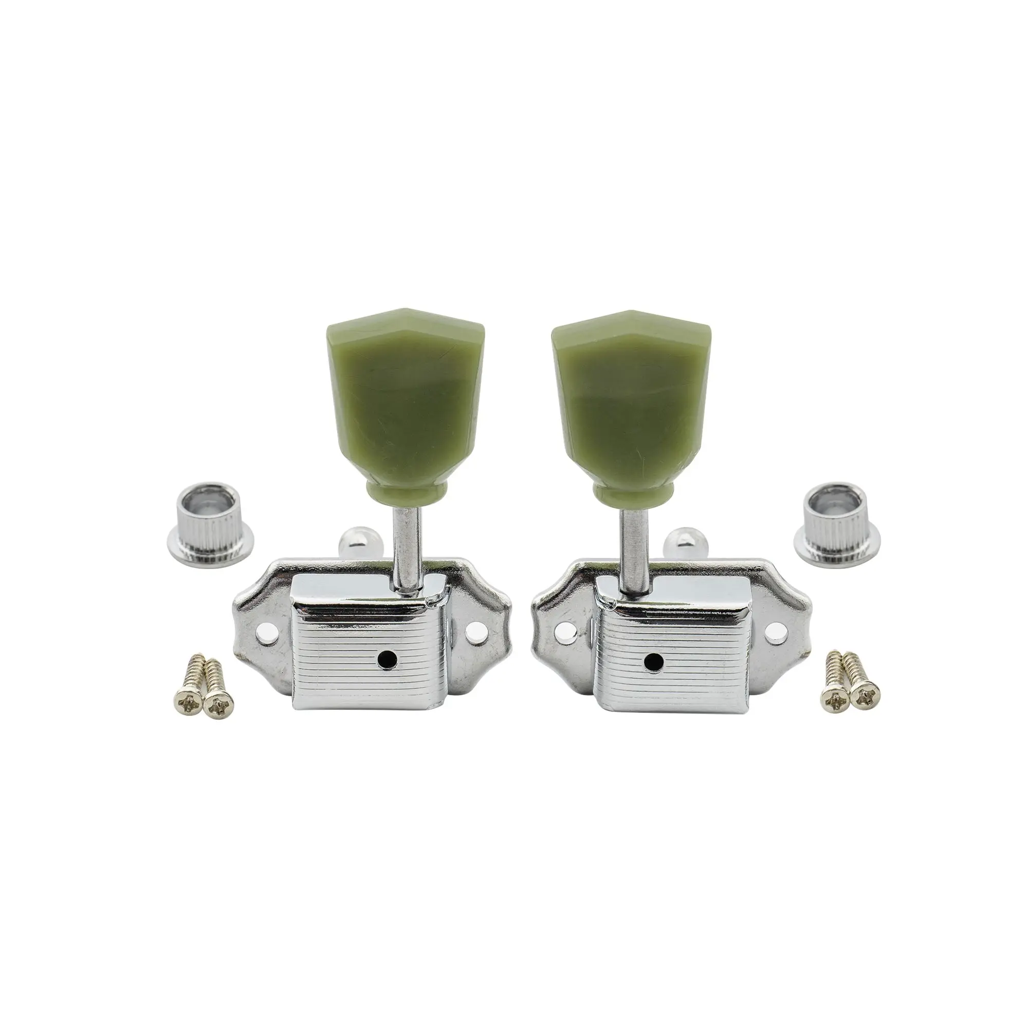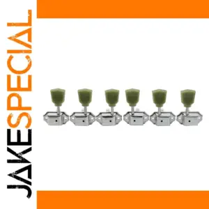 Imagine upgrading your guitar with this set of vintage-inspired tuners that perfectly blend classic style and precise tuning. Crafted from durable metal alloy with a high-quality finish, these tuning machines feature a sleek, rectangular chrome or gold housing with softly rounded edges, offering a polished and timeless look. The olive green plastic knobs, shaped like small, tapered rectangles, add a subtle splash of color while providing a comfortable grip. With a gear ratio of 15:1, each tuner ensures fine control for perfect intonation. Designed for compatibility with Les Paul and Epiphone-style guitars, these tuners are a reliable choice for players seeking stability, durability, and vintage charm in their instrument's headstock. Experience smooth tuning and lasting performance with this premium set.
