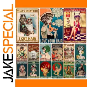 Transform your space with this charming vintage-inspired metal tin sign, perfect for embracing retro style. Measuring 20×30 cm (8×12″), it offers a nostalgic aesthetic that adds character to any room. Crafted from lightweight aluminum with a durable vintage finish, this sign combines bright, bold colors with classic 1950s-style illustrations of hair dressing themes. Its playful design features lively images of stylized hairstylists, retro hairstyles, and vibrant text, making it a standout piece for decor. Suitable for indoor or outdoor use, it’s easy to mount thanks to predrilled holes. Whether you want to elevate your salon, bar, cafe, or home decor, this sign brings a unique, lively vibe that complements vintage or eclectic aesthetics.