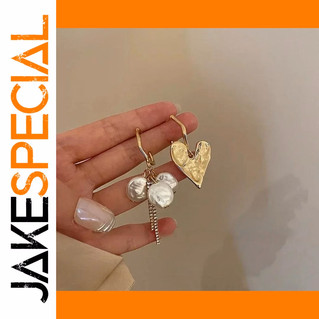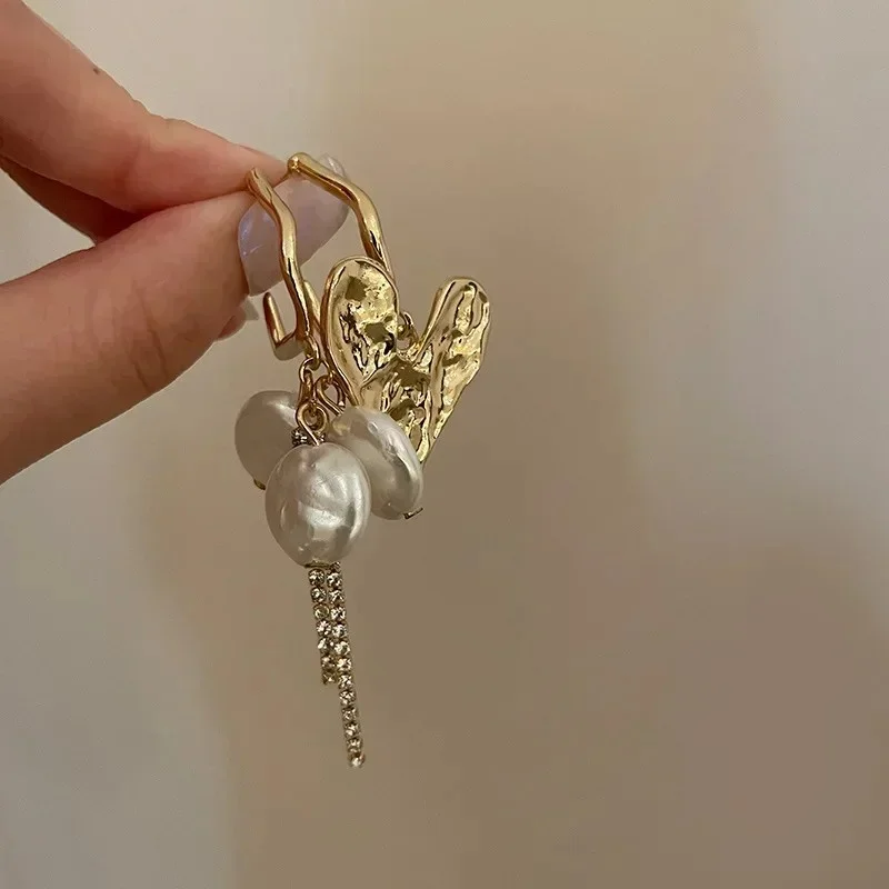 Step into a world of timeless elegance with these vintage-inspired drop earrings. Featuring a distinctive asymmetrical design, they boast textured, hammered gold-toned hearts that exude artisanal charm. Dangling beneath are clusters of shiny, smooth faux pearls, creating a playful yet sophisticated look perfect for party or evening wear. The addition of a vertical row of small rhinestones adds a subtle touch of sparkle, elevating these earrings to statement accessory status. Crafted from lightweight acrylic and zinc alloy in KC gold, they are comfortable for long hours while making a strong fashionable impression. Their unique, artistic silhouette is ideal for women who love to showcase their creative and vintage-inspired style.