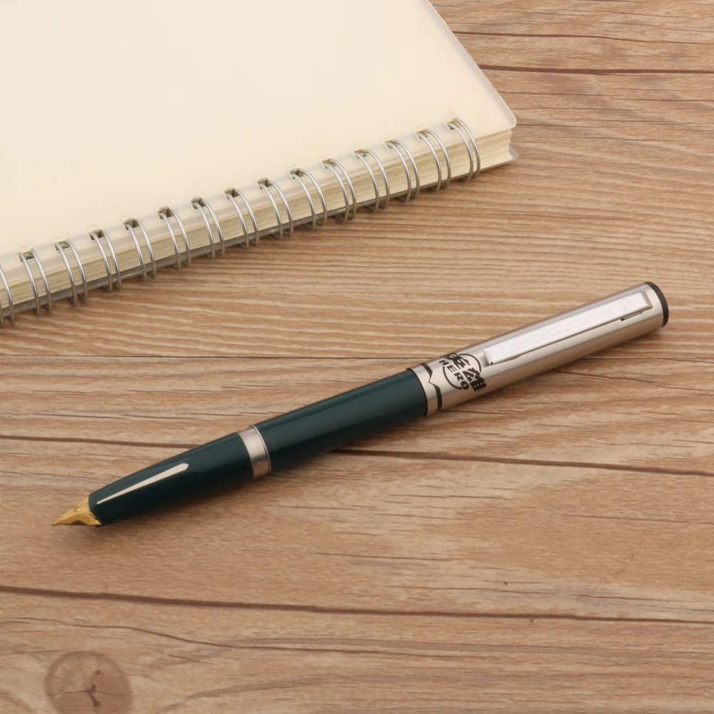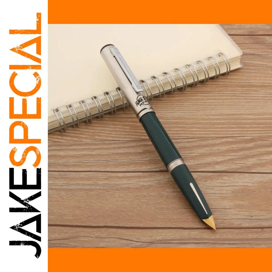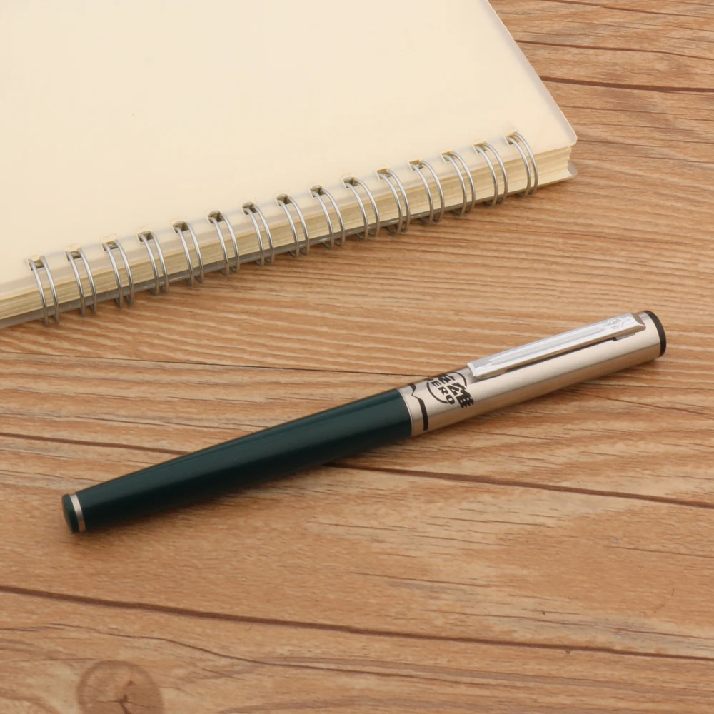 Experience the timeless elegance of this HERO 240 fountain pen, designed in a striking deep green with a glossy finish that captures the vintage 1990s aesthetic. Its classic retro style is complemented by metallic silver accents, including a silver clip with a matte finish and a decorative band around the middle. The exposed gold-colored duckbill aircraft nib adds a unique touch of sophistication, perfect for both everyday writing and special correspondence. Crafted from durable plastic, this pen balances style and functionality seamlessly. Ideal for office or school use, it offers a smooth 0.5mm writing point that ensures crisp, clean strokes. Embrace the craftsmanship and nostalgic charm that make this pen a treasured addition to your collection.