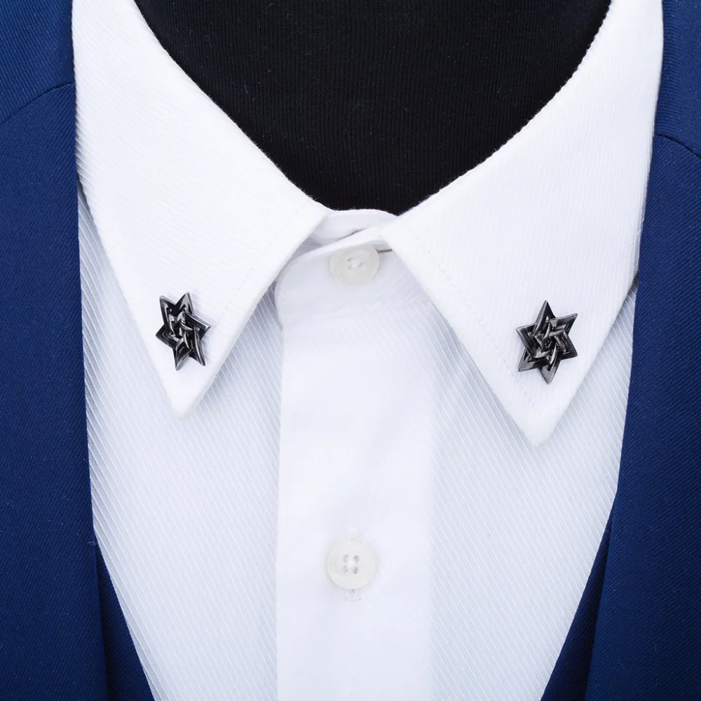 Enhance your style with this vintage-inspired hexagonal star brooch and cufflinks set, crafted from alloy in a sleek light grey finish. Featuring a bold, geometric design with interwoven metal strips forming a three-dimensional star with six points, these accessories exude a rugged, retro aesthetic. Suitable for unisex use, they are ideal for adding a masculine touch to jackets, backpacks, hats, or DIY projects. Measuring precisely as shown, with a slight size variation of 1-3mm, each piece showcases a matte, textured surface that highlights its antique and patriotic vibe. Perfect for formal or casual occasions, they blend vintage charm with versatile styling.