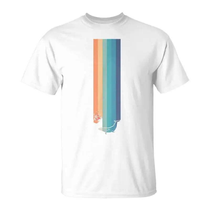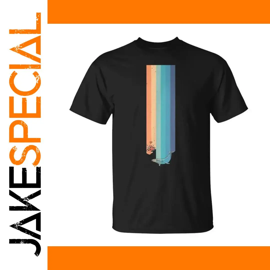 Experience a blend of nostalgic style and modern comfort with this vintage Hitchhiker-themed T-shirt. Crafted from soft, breathable cotton, it ensures all-day comfort. Its casual design features five pastel-colored stripes in a distressed vintage look, running vertically down the front, with shades of peach-orange, pink, blue, teal, and medium blue. A minimalist scene of a teal whale emerging from the stripes adds a lively, dynamic touch. Small contrasting black and pink tree illustrations enhance its organic charm. Perfect for casual wear, this lightweight, short-sleeved T-shirt is versatile for winter and everyday outfits. Designed for a perfect fit, it’s easy to care for and available in multiple sizes and two color options. Elevate your wardrobe with this playful, stylish piece that complements any casual look.