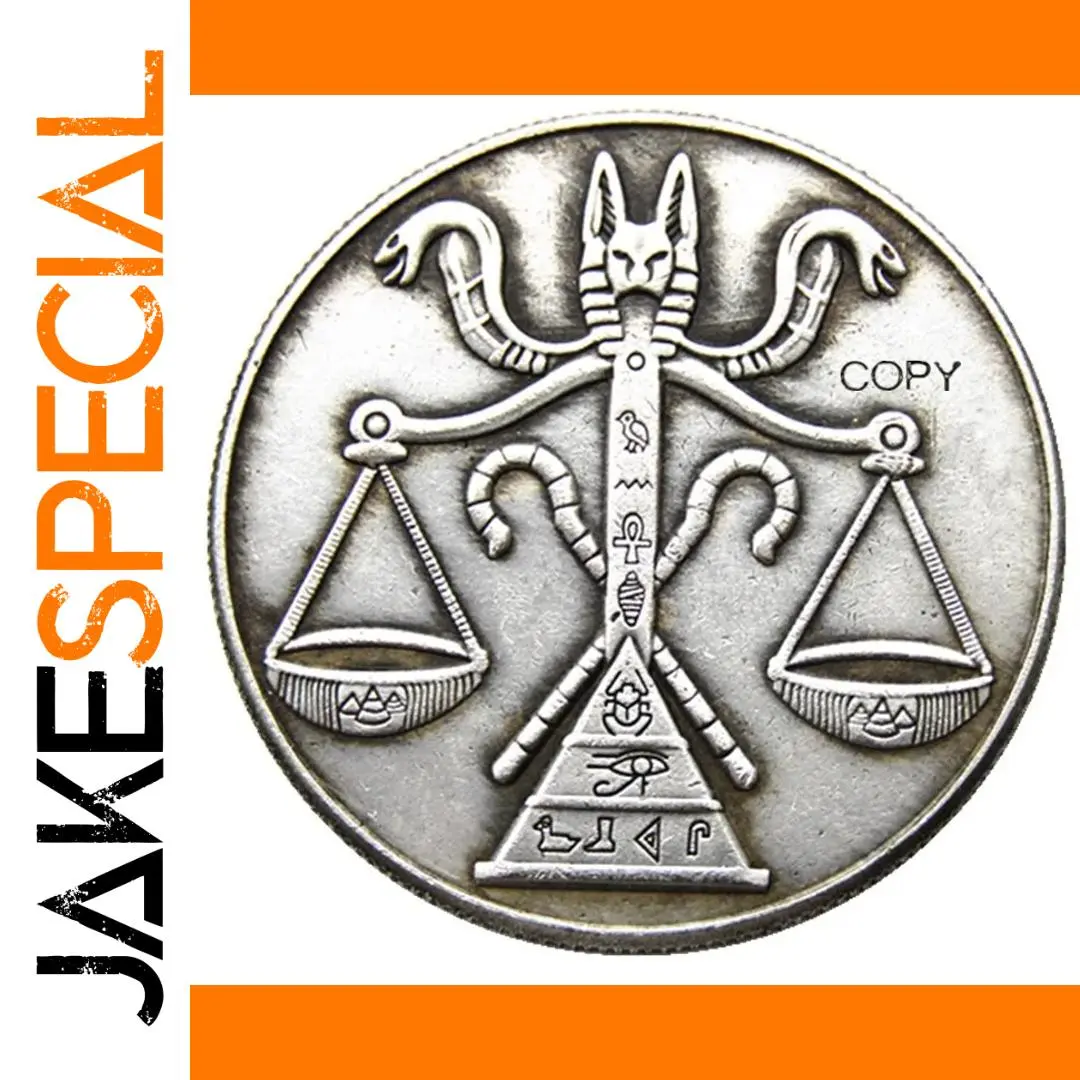Step into history with this striking vintage-style metal coin, inspired by the Hobo Morgan design. Its distressed, antiqued silver finish evokes a nostalgic aura reminiscent of the late 19th century, specifically between 1880 and 1899. The coin’s surface features detailed craftsmanship, portraying a captivating skull and zombie motif with Egyptian-inspired symbols, hanging scales, and intricate engravings. The weathered look adds an old-world charm that enhances your collection or display. Whether you're a history enthusiast or a lover of mystical, patriotic artifacts, this coin offers a unique blend of retro aesthetics and symbolic artistry. Imagine holding a piece that combines the allure of antique craftsmanship with bold, symbolic imagery, perfect for collectors seeking authentic vintage pieces.