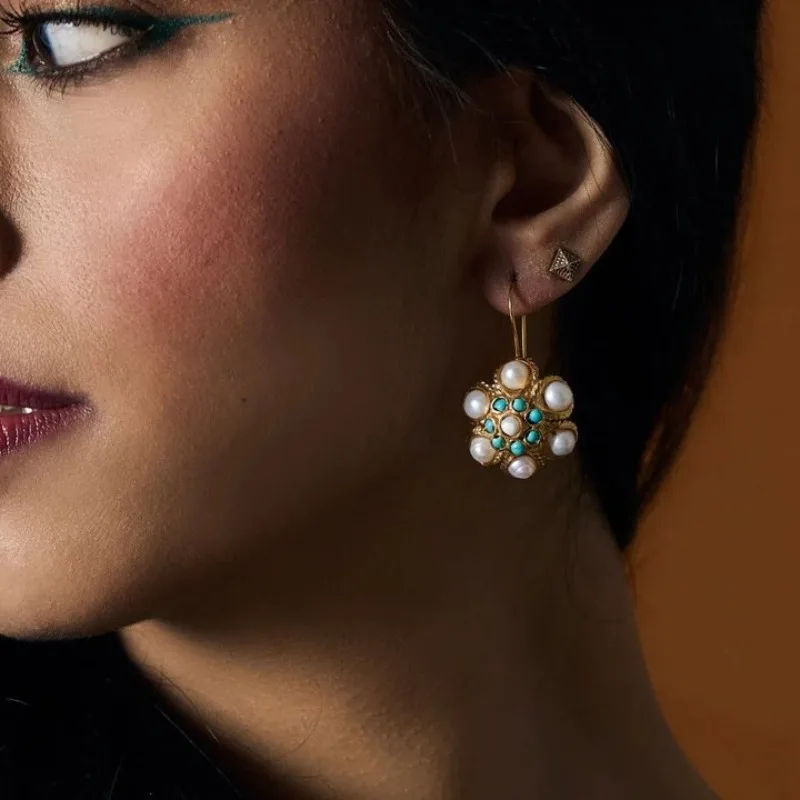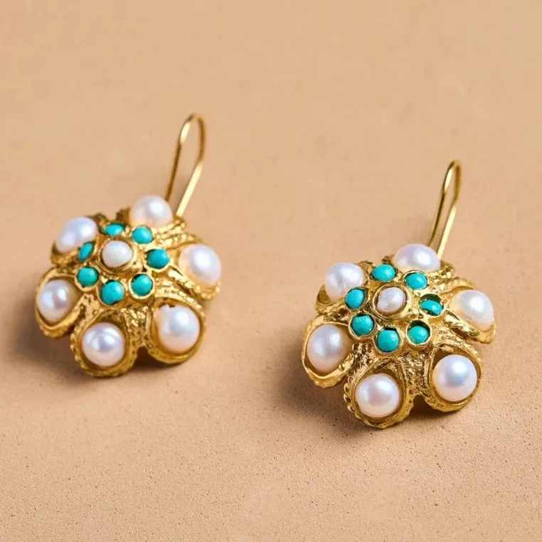 - Technical specifications include zinc alloy construction, inlaid turquoise stone, simulated pearls, and a simple, sleek hook for pierced ears, ensuring both style and comfort.