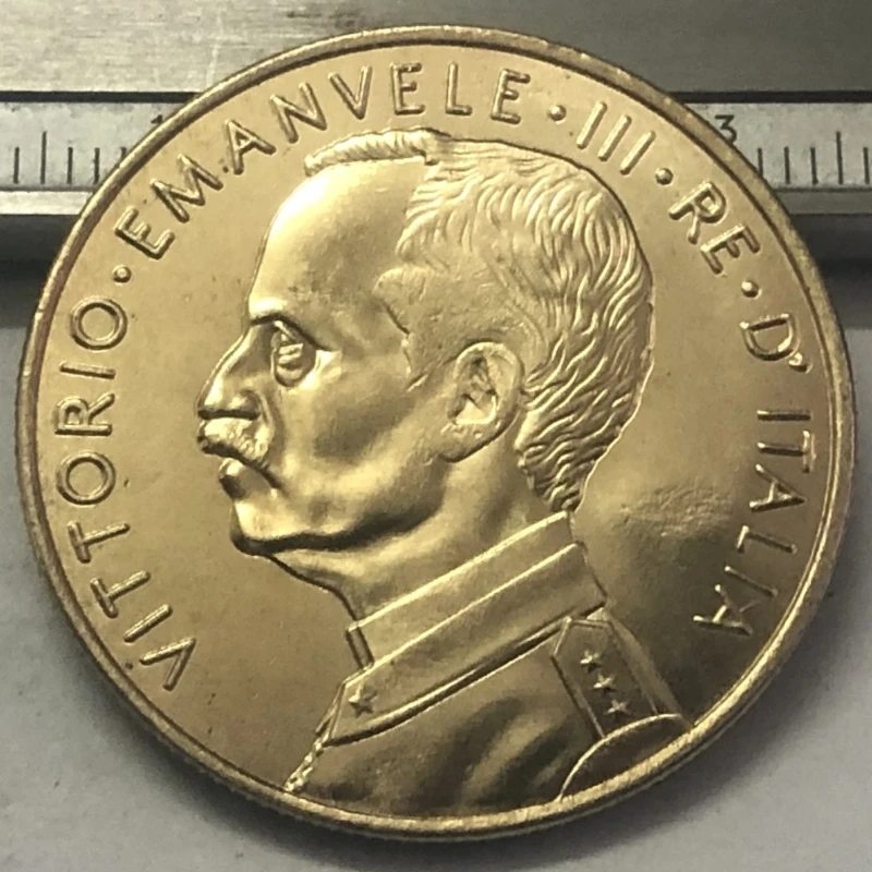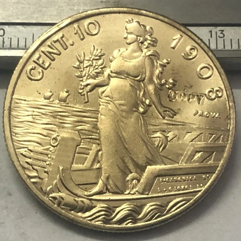 This antique-style replica Italian coin, dated between 1900 and 1919, features a detailed high-relief design of Vittorio Emanuele III. Crafted with a casted technique from metal, it boasts a rich metallic gold tone and textured surfaces that highlight intricate embossing. The obverse depicts a regal woman dressed in classical attire, holding a laurel or olive branch, symbolizing peace or victory, set against a background of horizontal lines representing water or landscape. Wavy lines along the lower edge evoke waves, enhancing its maritime theme. This convincingly detailed imitation captures the historic essence of early 20th-century European coins, perfect for collectors or display.